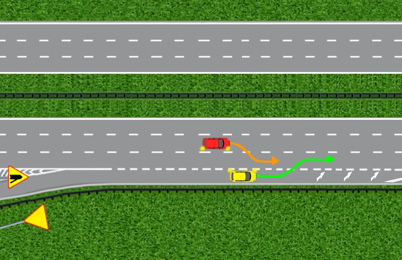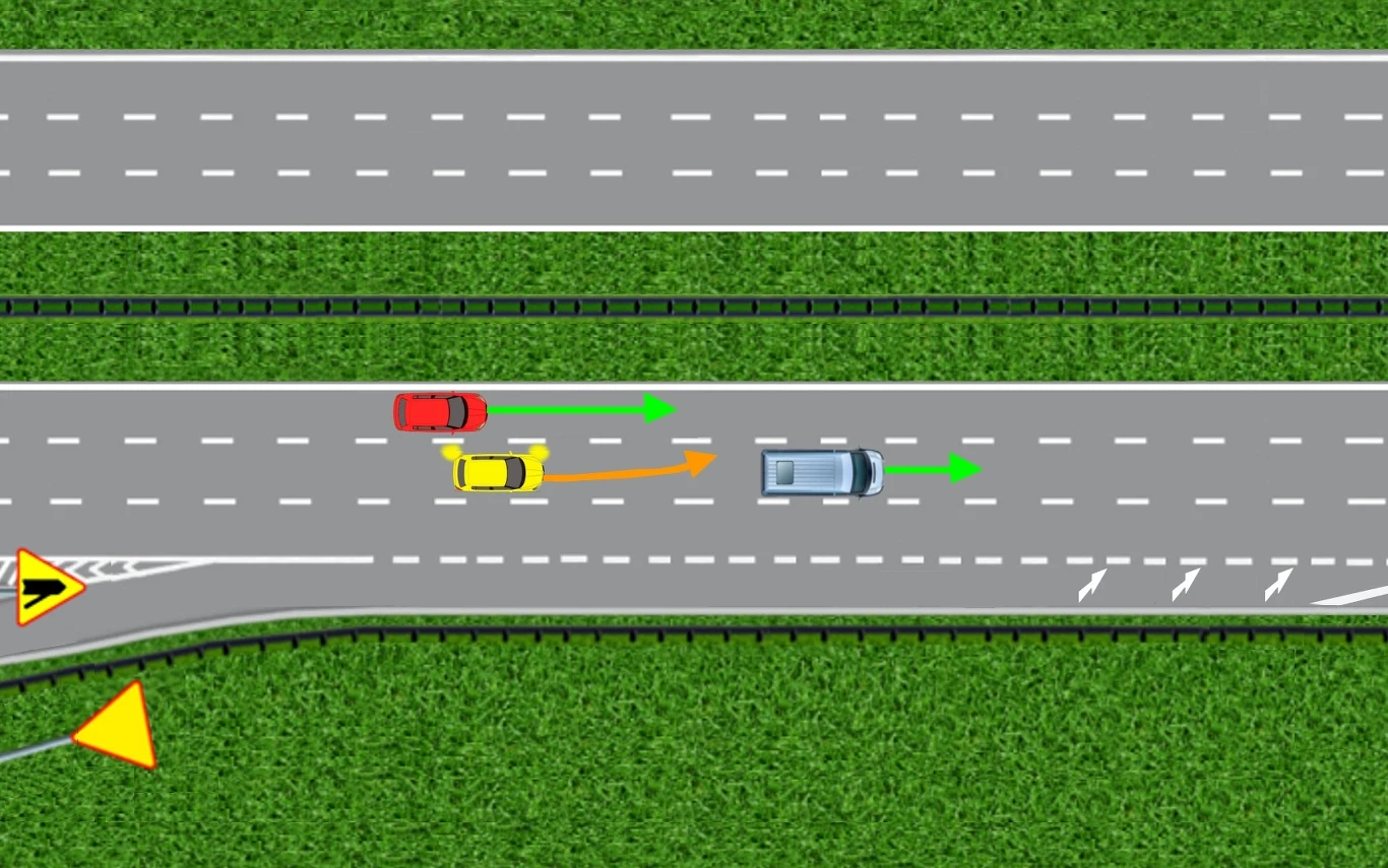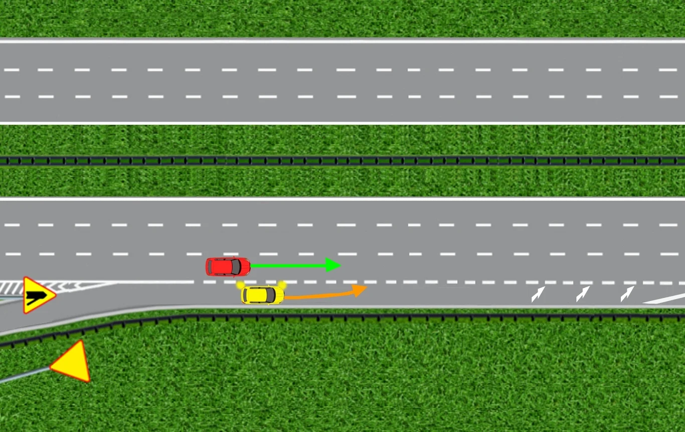 Oto przykład. Kierujący żółtym samochodem zamierza przejechać z pasa rozbiegowego na sąsiedni pas. Żółty samochód musi ustąpić pierwszeństwa czerwonemu autu, bo zmienia pas ruchu.