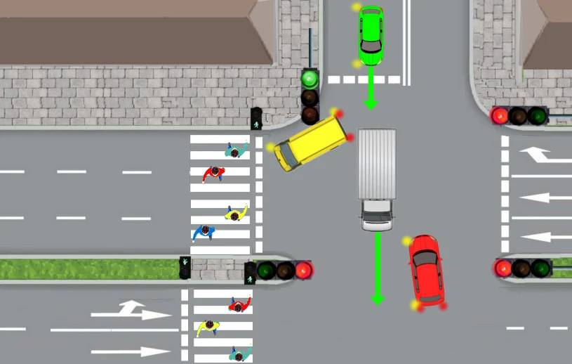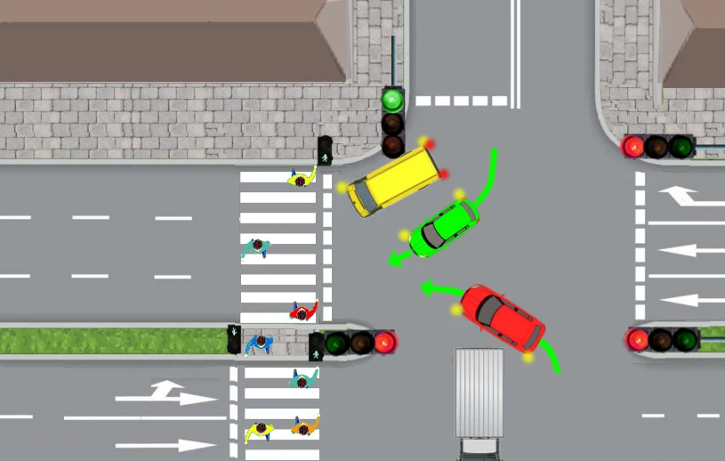 Zamierzałem skręcić na lewy pas poprzecznej, trzypasowej jezdni. Zakładałem, że kierowca zielonego samochodu skręci na sąsiedni, środkowy pas, który był wolny. Kiedy przystąpiłem do skręcania okazało się, że zielony samochód wpycha się na lewy pas, zamiast na środkowy.