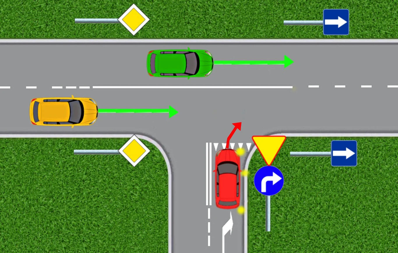 Zbadajmy to na przykładzie: czerwony samochód skręca na skrzyżowaniu w prawo. Wyraźnie nakazuje to "nakaz skręcenia w prawo za znakiem". Nie może skręcić w lewo, bo droga poprzeczna jest jezdnią jednokierunkową.