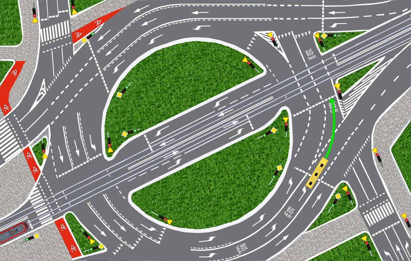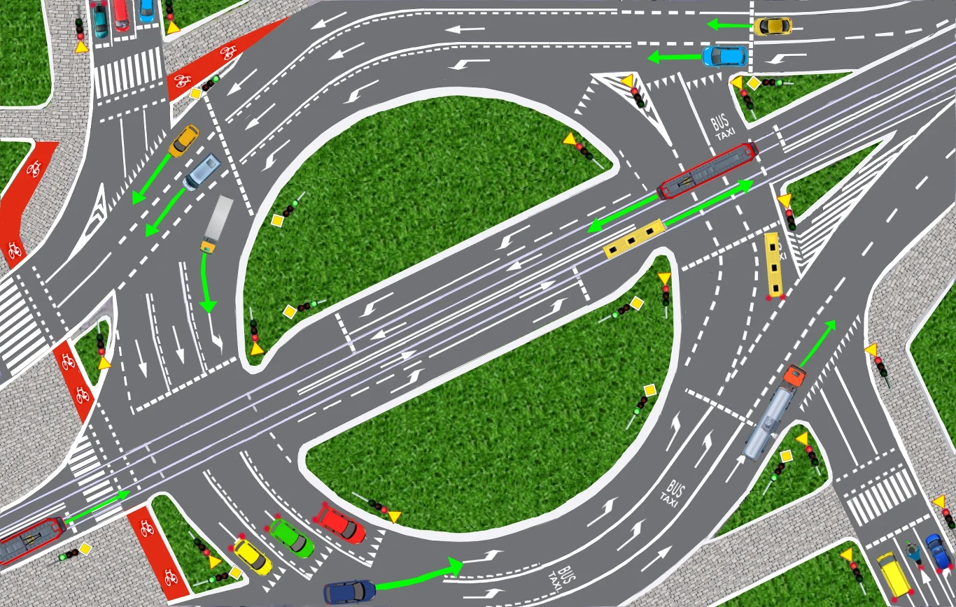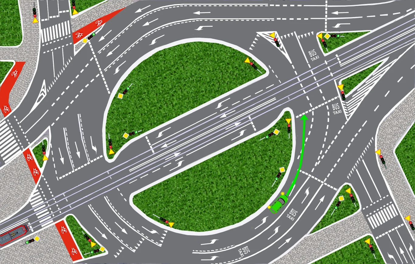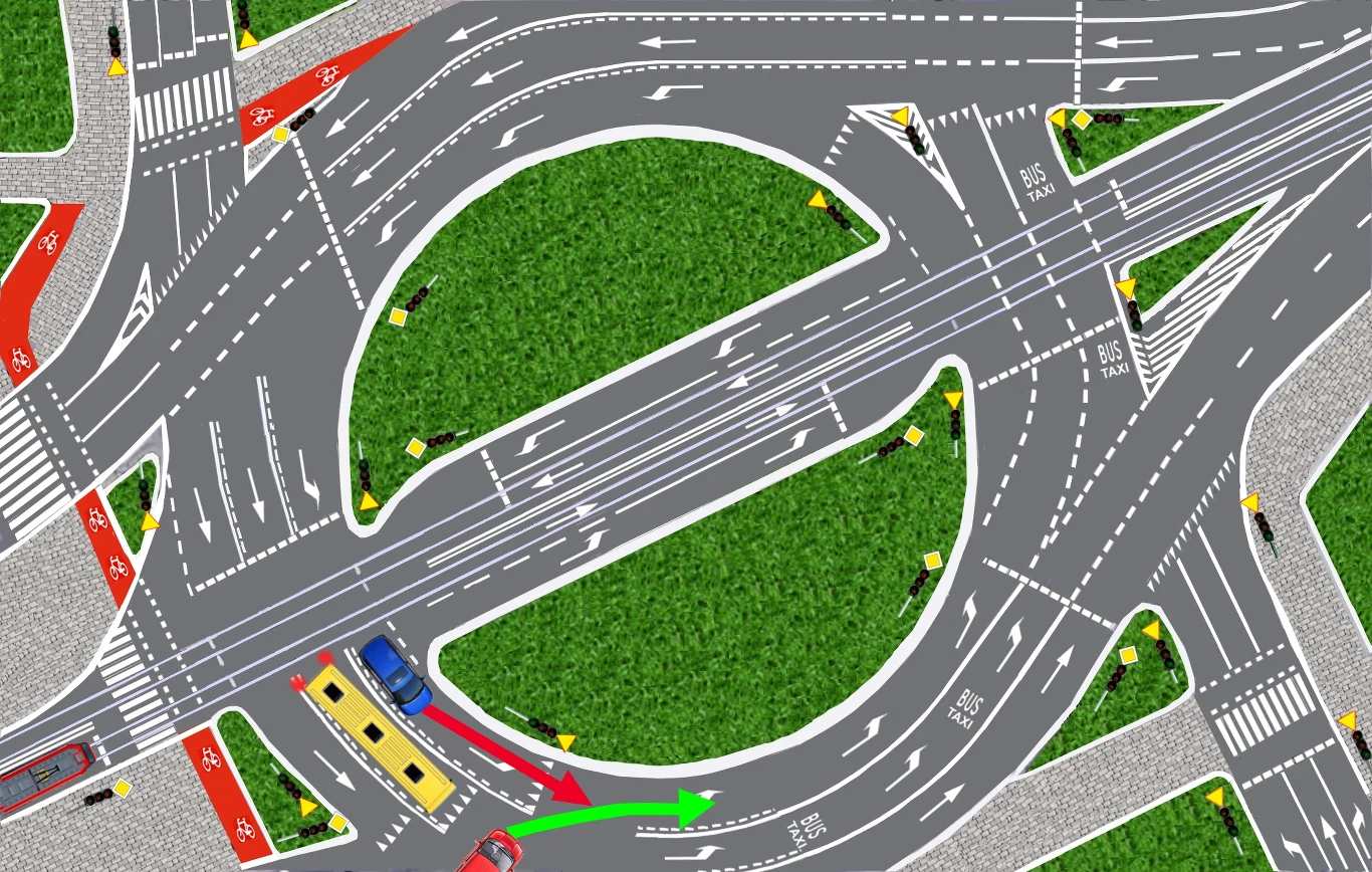 Tym niemniej, na rondzie z sygnalizacją świetlną wciąż używamy kierunkowskazów jak na zwykłych skrzyżowaniach. Owszem, zielony samochód podążając torem jazdy pokazanym na rysunku nie zmienia pasa ruchu. Ponadto, znajdując się przed pierwszym sygnalizatorem, nie ma praktycznie możliwości pojechania w innym kierunku. Pas ruchu ściśle go prowadzi.