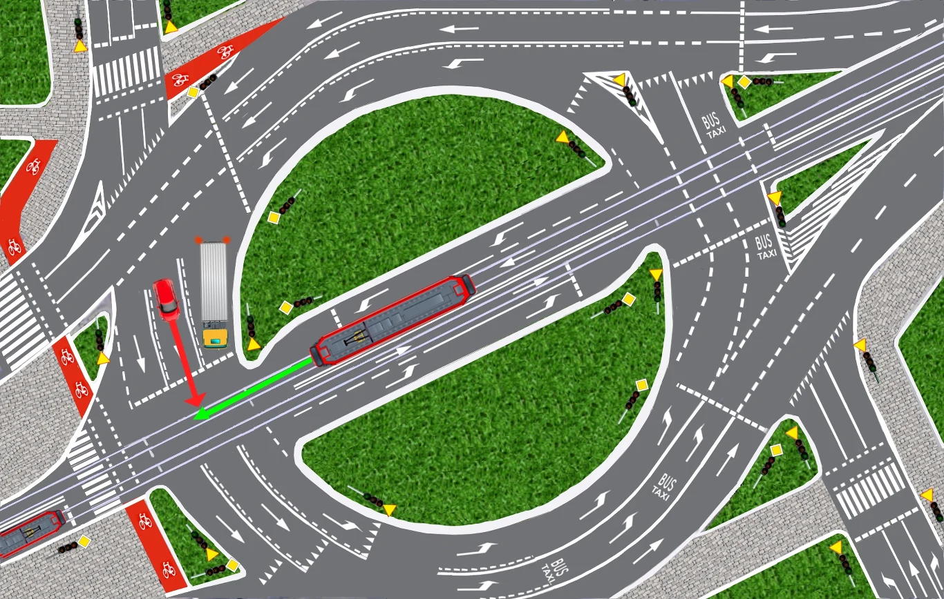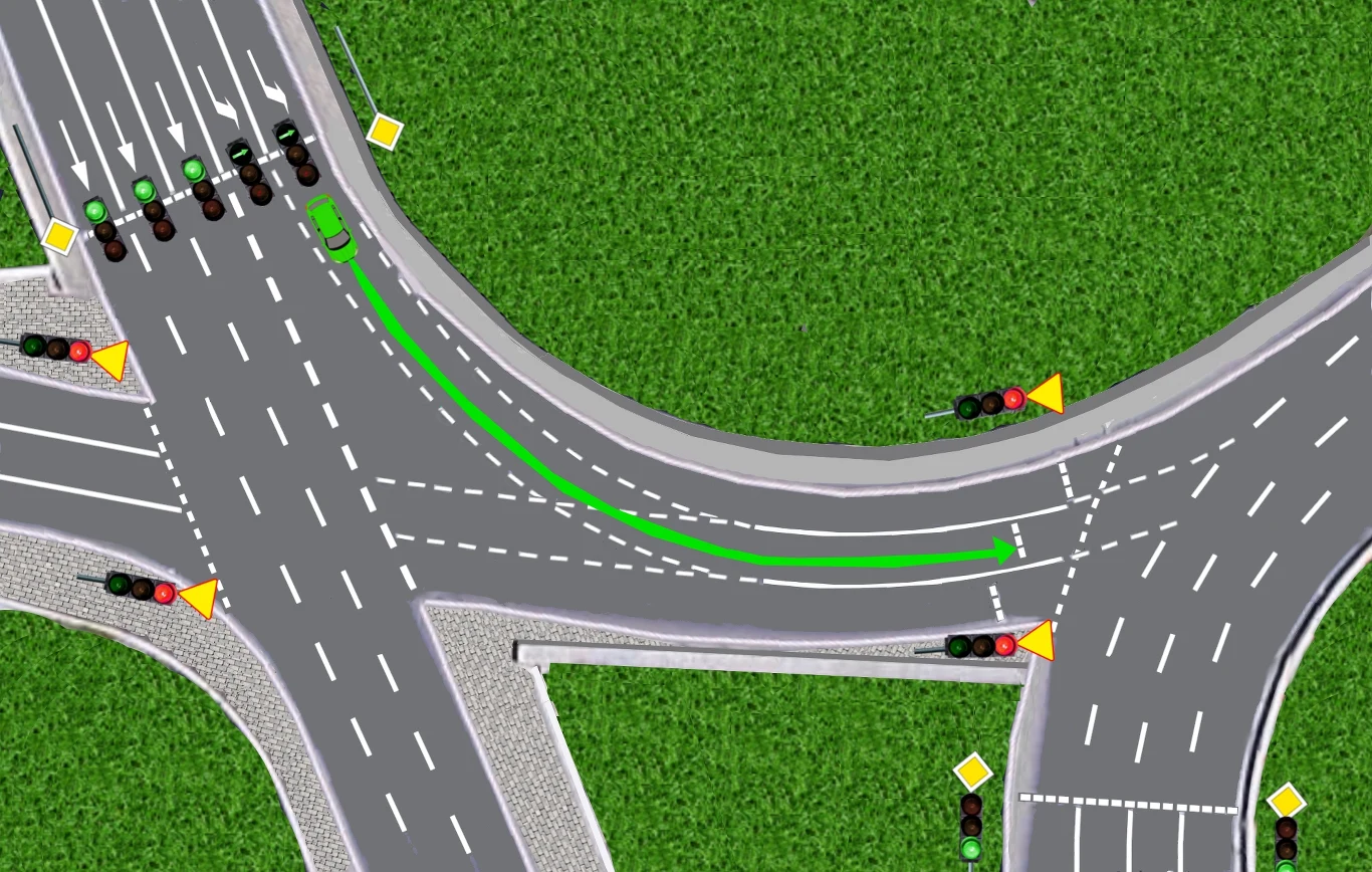 Na pokazanym powyżej prostym skrzyżowaniu w kształcie litery T czerwony samochód miałby teoretycznie możliwość skręcenia w lewo, co oczywiście byłoby sprzeczne z oznakowaniem i niebezpieczne, ale fizycznie wykonalne.