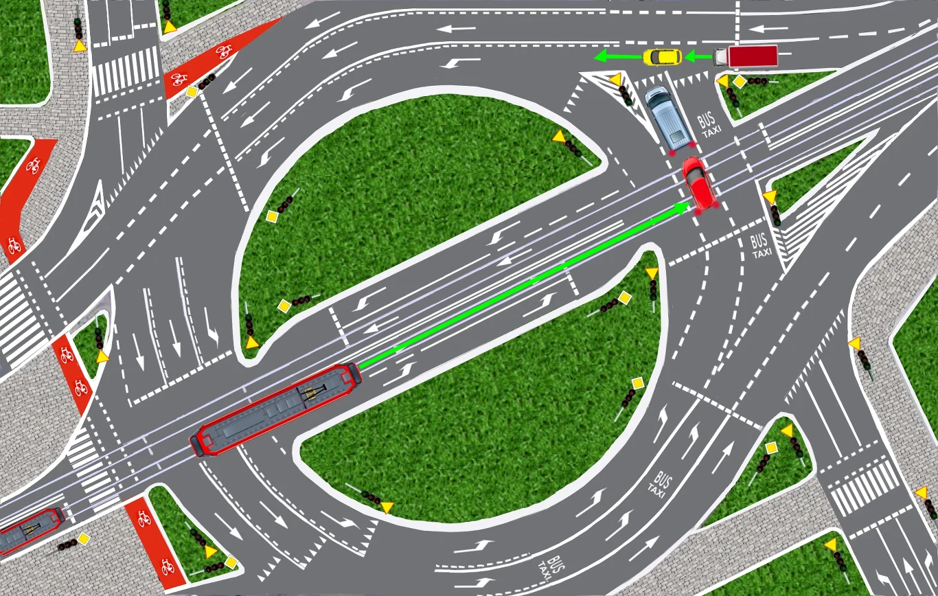 W tej sytuacji ruchem na rondzie kieruje sygnalizacja świetlna. Ten kierowca, dla którego wyświetlany jest sygnał zielony, może jechać. Ci, dla których wyświetlane jest światło czerwone, stoją i czekają.