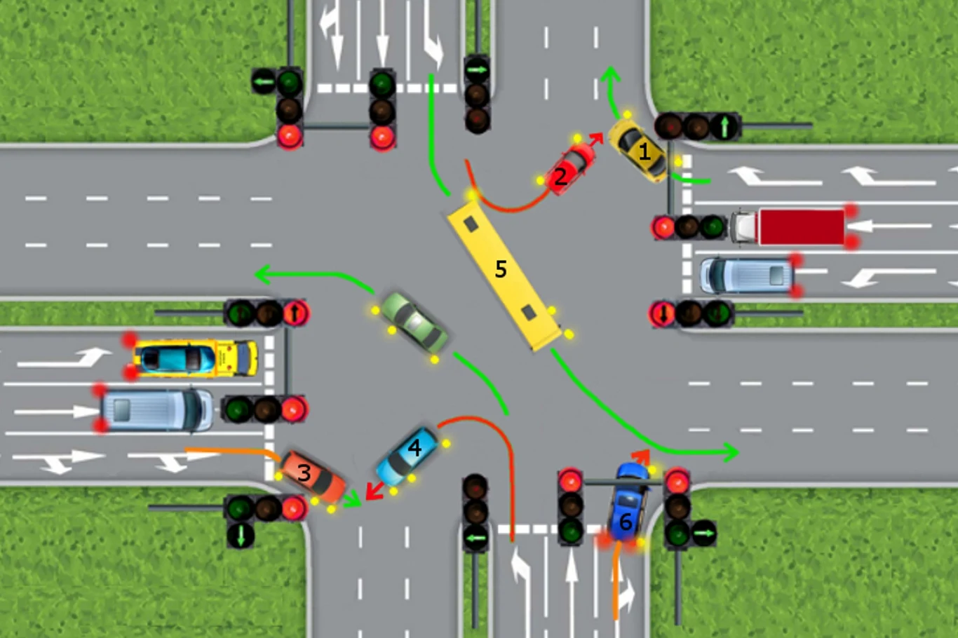 Zerknijcie jeszcze na pojazdy nr 5 i nr 6. Na niektórych skrzyżowaniach zdarza się, że dozwolony jest dla niebieskiego samochodu nr 6 skręt warunkowy podczas wyświetlania zielonej strzałki. W takim przypadku kierowca tego auta musi jednak bezwarunkowo ustąpić pierwszeństwa pojazdom, dla których ruch jest otwarty sygnalizatorem S-3 do skręcania w lewo, na przykład autobusowi nr 5.