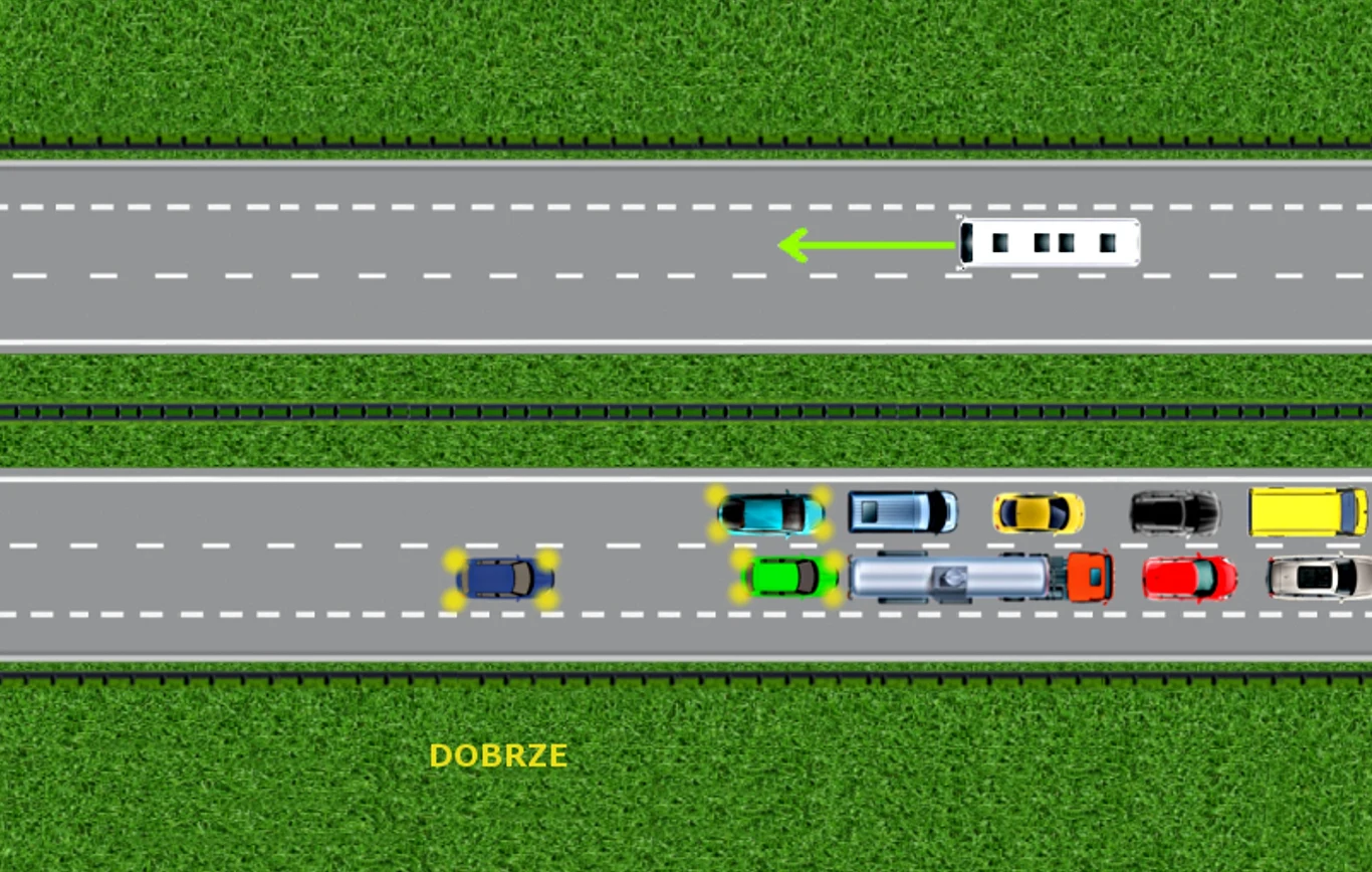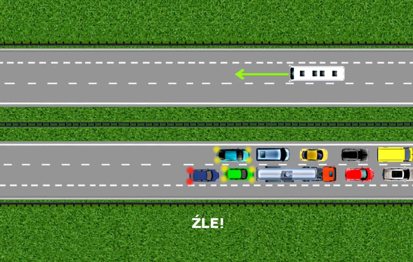 Wróćmy do początku tej sytuacji. Dostrzegasz stojące pojazdy, od razu włączasz światła awaryjne i hamujesz patrząc uważnie w lusterko.