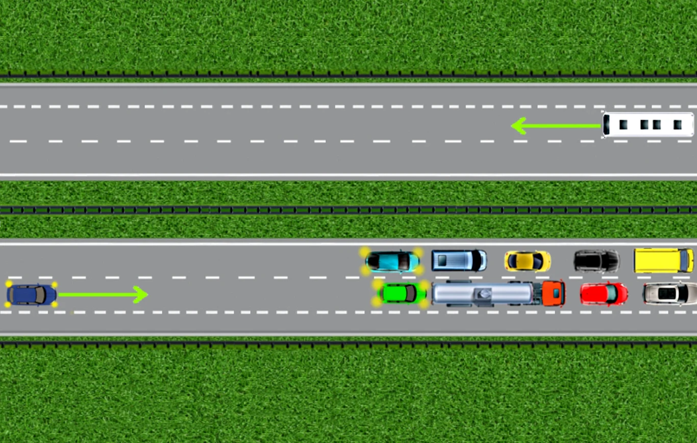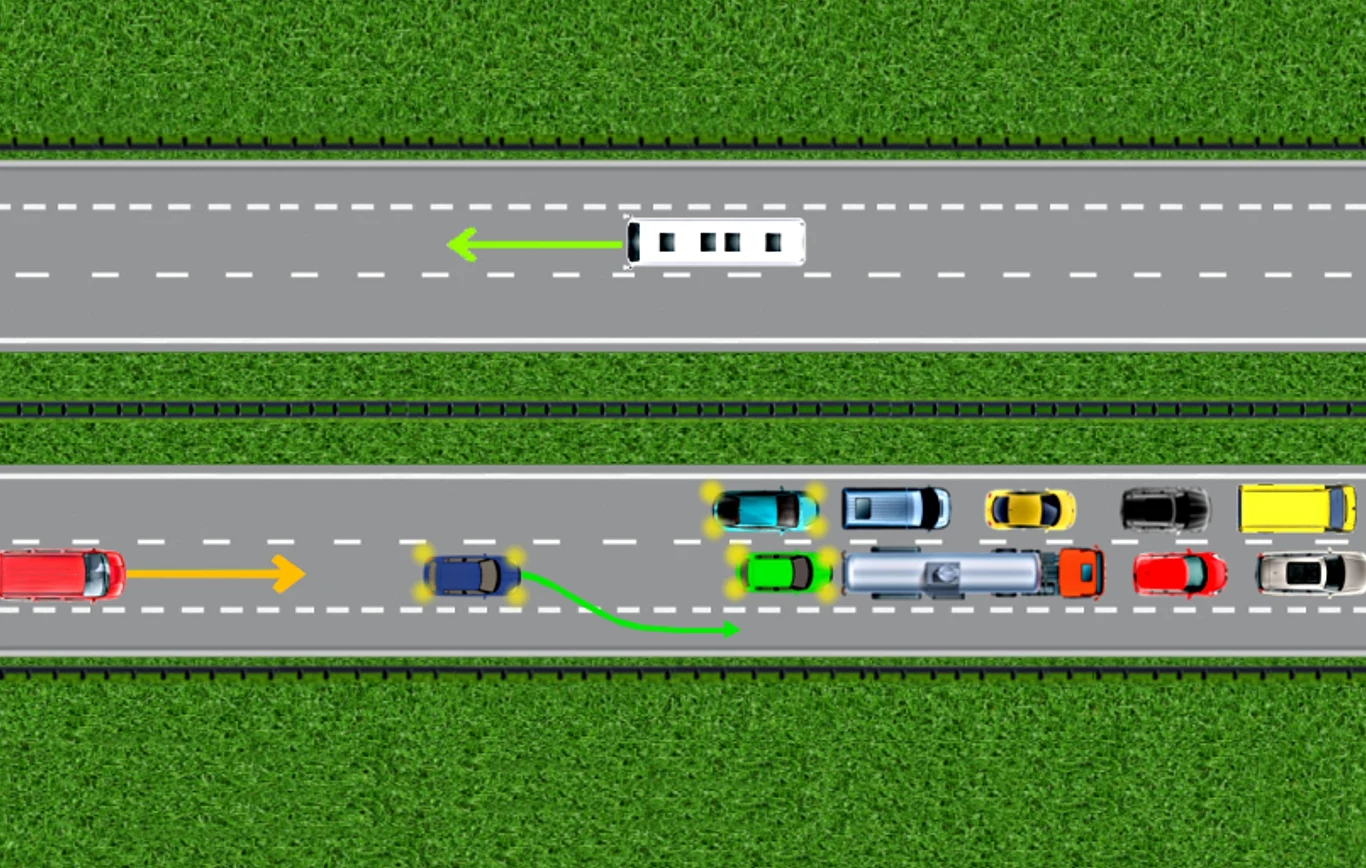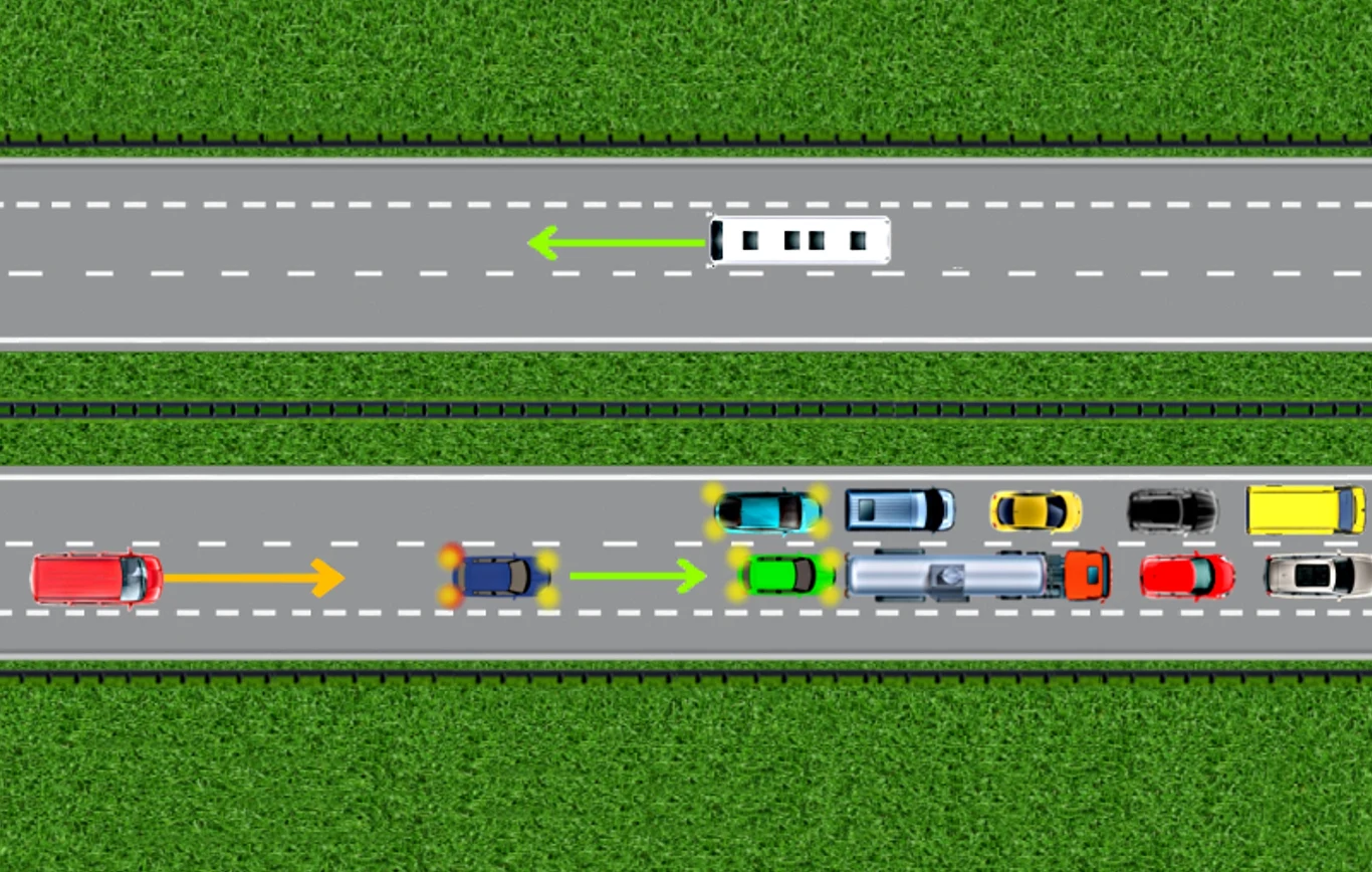 Zatrzymujesz się w odległości co najmniej 15 metrów od poprzedzającego samochodu. Dlaczego? Bo ten dystans umożliwi ci awaryjną ucieczkę, jeśli dostrzeżesz z tyłu pędzący na ciebie samochód.