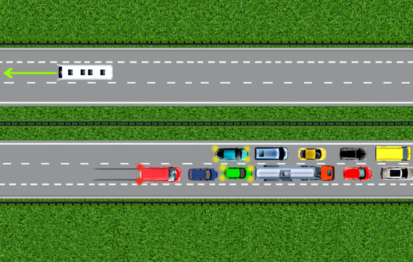 Z tyłu, za tobą pędzi kolejny pojazd. Jego kierowca dostrzega stojące przed nim samochody, ale niestety okazuje się, że nie starczy już miejsca na wyhamowanie.