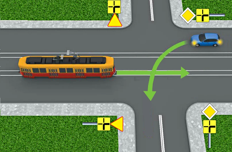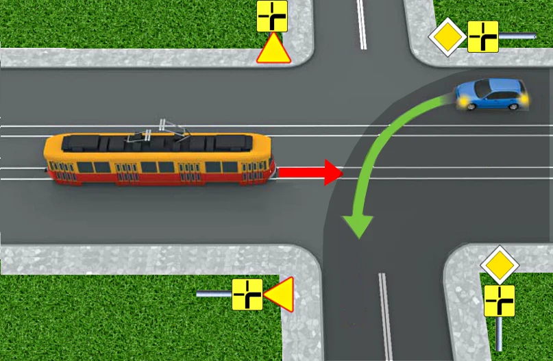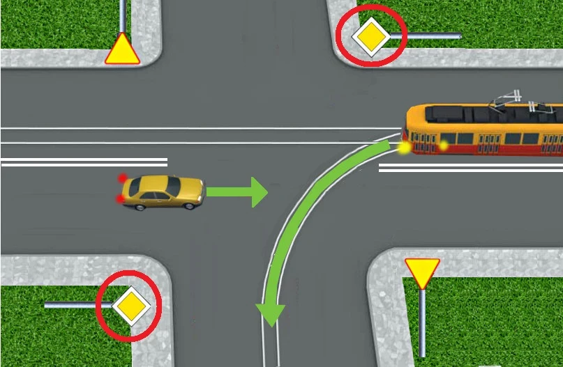 W tej sytuacji pierwszeństwo ma samochód czy tramwaj? Oczywiście samochód, ponieważ znajduje się on na drodze z pierwszeństwem.