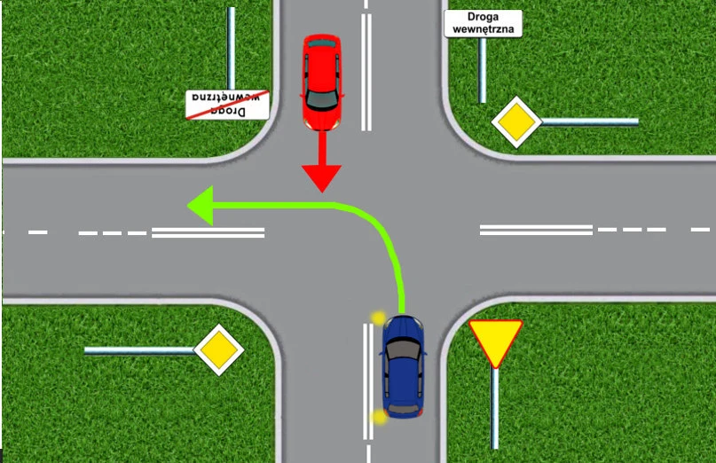 Co więcej, nie jest to również skrzyżowanie równorzędne, zatem nie obowiązuje zasada prawej ręki. Wyjeżdżający z drogi wewnętrznej musi ustąpić pierwszeństwa pojazdom i osobom poruszającym się drogą publiczną, ponieważ w tej sytuacji włącza się do ruchu.