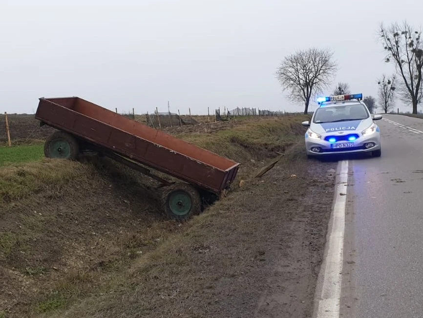 Przyczepa została w rowie, a ciągnik przecinając drogę wojewódzką nr 812 wjechał na pole, gdzie zaczął jeździć w koło. Po pewnym czasie mężczyźnie udało się dogonić ciągnik, wsiadł do niego i ruszył w kierunku domu. Został zatrzymany przez policjantów. "Okazało się, że 36-latek miał w organizmie ponad 2,2 promila alkoholu. W przeszłości zostały mu też cofnięte uprawnienia do kierowania" - dodał Wasilewski. 36-latkowi grozi teraz kara do 2 lat pozbawienia wolności.