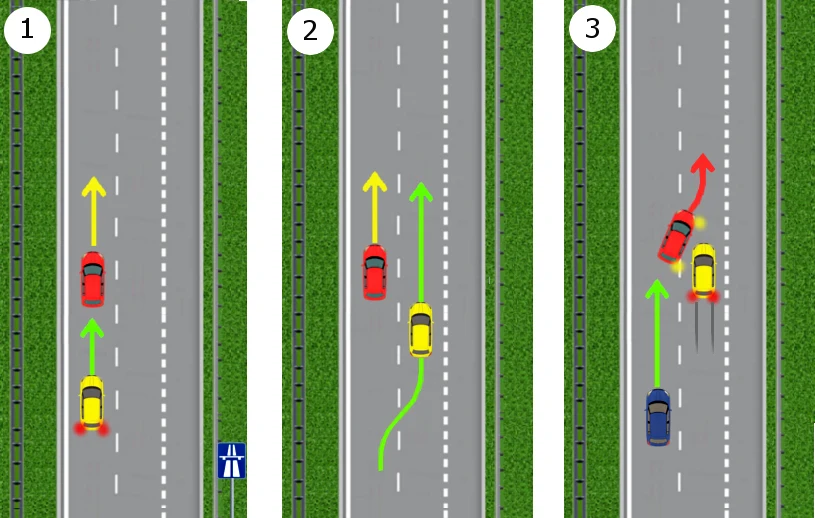 Kierowca czerwonego auta jedzie bez żadnej potrzeby lewym pasem, a w dodatku nie kontroluje w sposób ciągły sytuacji za swoim pojazdem. Po postu nie patrzy w lusterka. W tym czasie kierowca żółtego samochodu, widząc zawalidrogę, postanawia wyprzedzić go prawym pasem.