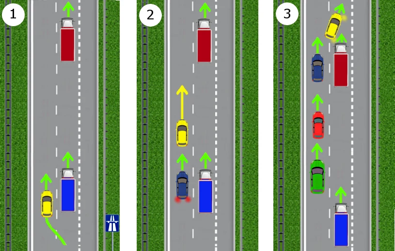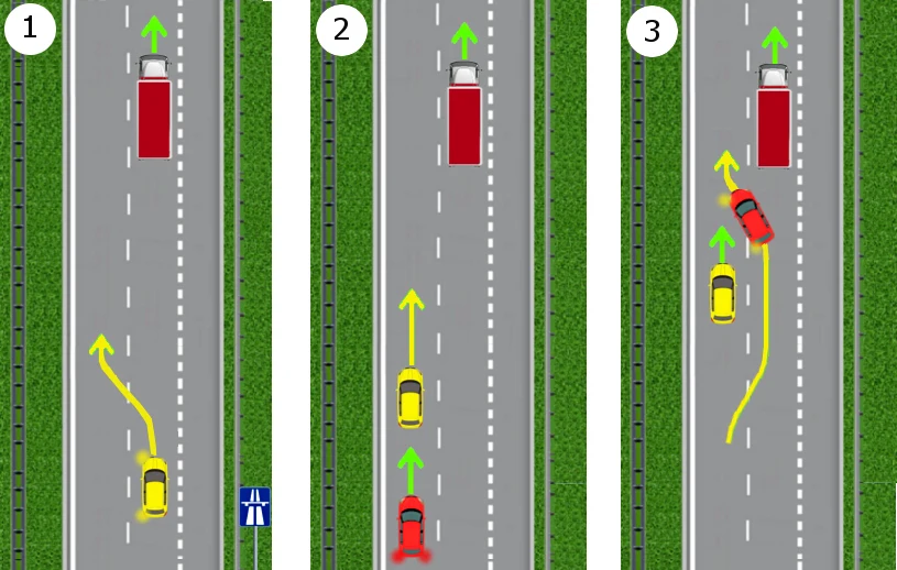 Kierowca żółtego samochodu rozpoczyna wyprzedzanie jadącej przed nim ciężarówki. Po jej wyprzedzeniu dostrzega jadącą w oddali następną ciężarówkę, a więc pozostaje na lewym pasie. W tym czasie z tyłu zbliżają się inne, jadące lewym pasem samochody. Ich kierowcy hamują i czekają, aż kierowca żółtego auta zakończy wyprzedzanie drugiej ciężarówki. Żeby tylko drugiej! Jeśli na prawym pasie znajduje się kilka pojazdów, to kierowca żółtego auta będzie tak jechał lewym pasem przez kilka kilometrów, aż wyprzedzi wszystkie samochody.