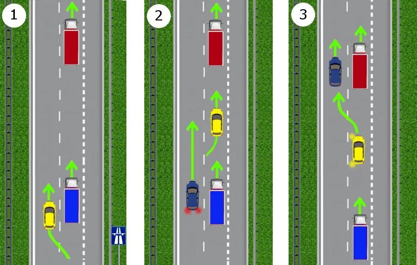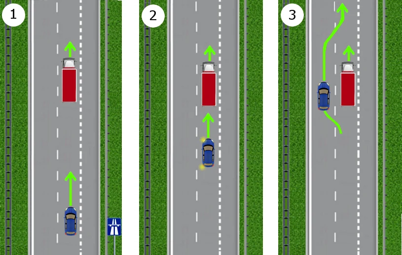 Na autostradach i drogach ekspresowych wyprzedzanie powinno trwać jak najkrócej. Spójrzcie na jeszcze jeden rysunek: