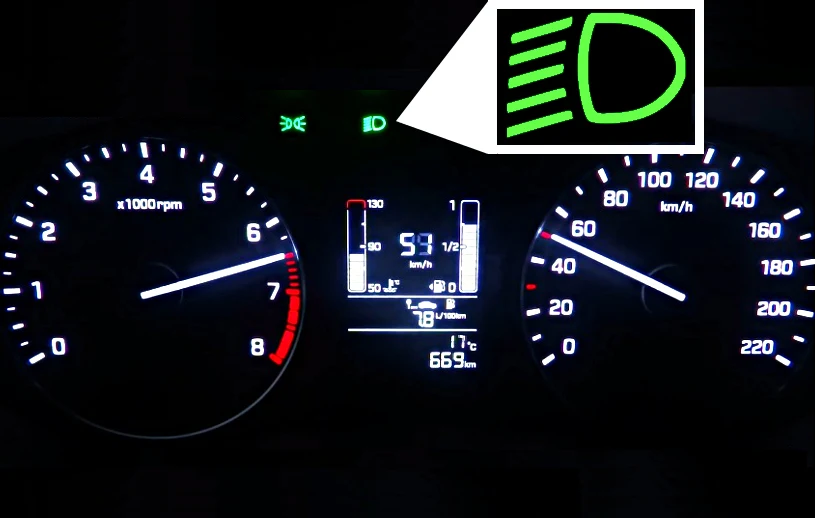 Nie jest też chyba jakimś mega odkryciem stwierdzenie, że po włączeniu świateł podświetlone zostają także wskaźniki w samochodzie, popularnie mówiąc: zegary. Jeżeli nie są podświetlone, to żadne światła w samochodzie nie zostały włączone. Tu jednak należy mieć na uwadze, że wskaźniki podświetlają się już po włączeniu świateł pozycyjnych, a w niektórych autach zawsze są podświetlone. Bardzo pomocna jest zielona lampka kontrolna z symbolem świateł mijania umieszczona na tablicy wskaźników (na rysunku została powiększona). Ta lampka nie stanowi jednak obowiązkowego wyposażenia samochodu i niestety w niektórych modelach nie występuje - zamiast tego na zielono świecą się zwykle oznaczenia przy włączniku świateł.