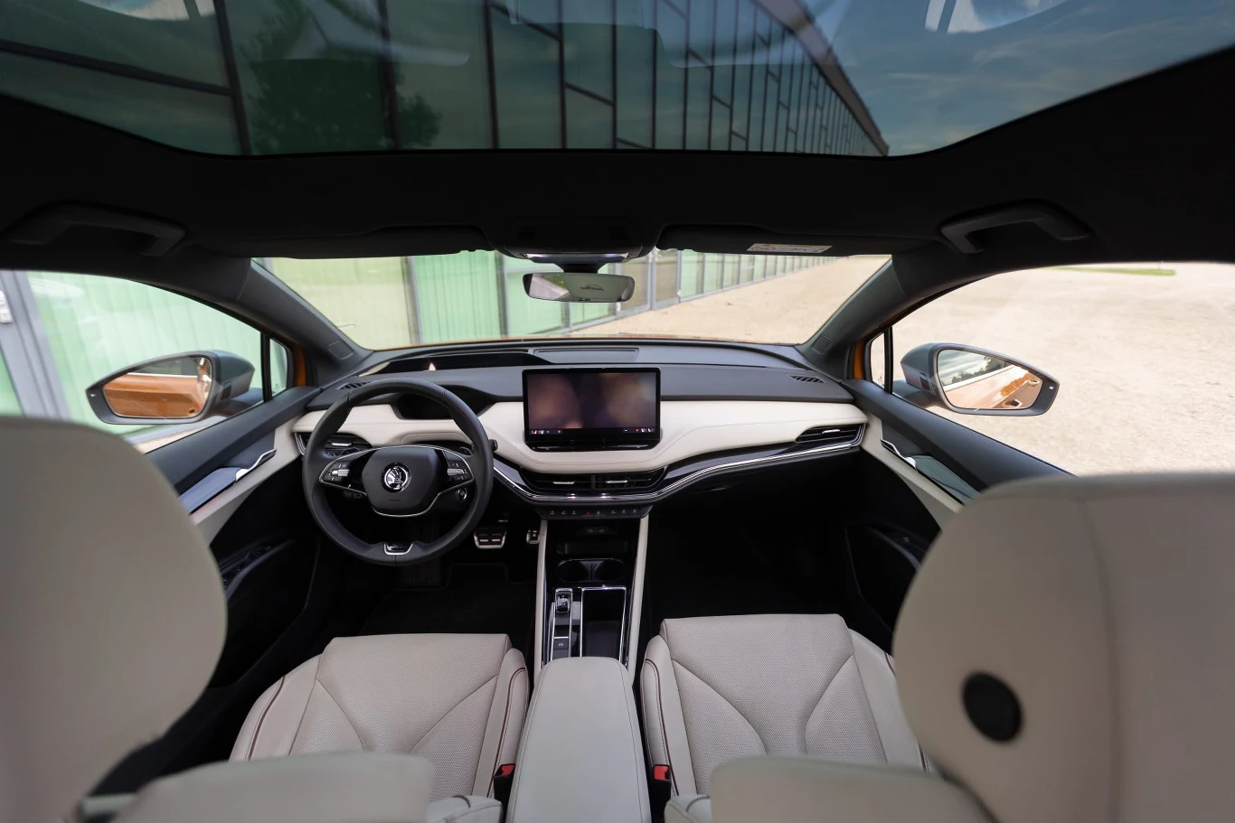 Luksus to oczywiście rzecz względna, ale jeśli na pokładzie w standardzie wersji L&K są takie elementy jak matrycowe reflektory, panoramiczne okno dachowe (szkoda, że bez przesłony), podgrzewana kierownica i fotele (również zewnętrzne siedzenia z tyłu) oraz wentylowane przednie siedziska, a do tego elektrycznie regulowane fotele przednie z pamięcią i opcją masażu na odcinku lędźwiowym oraz beżowa, skórzana tapicerka z obszyciami tunelu centralnego to chyba nie jest źle. Zarówno jasna tapicerka jak i “panorama" sprawiają, że poczucie przestrzeni w kabinie jest jeszcze lepsze niż w rzeczywistości - przyczepić się można jedynie do ilości miejsca na stopy, gdy przednie fotele są w najniższej pozycji. Szczególne wrażenie na otoczeniu Enyaq robi po zmroku, kiedy przednia osłona chłodnica z chromowanym wykończeniem podświetla się 131 diodami LED. Zdajemy sobie sprawę, że takie świetlne ozdobniki nie każdemu mogą przypaść do gustu, ale mimo wszystko w Skodzie przyciągają uwagę.