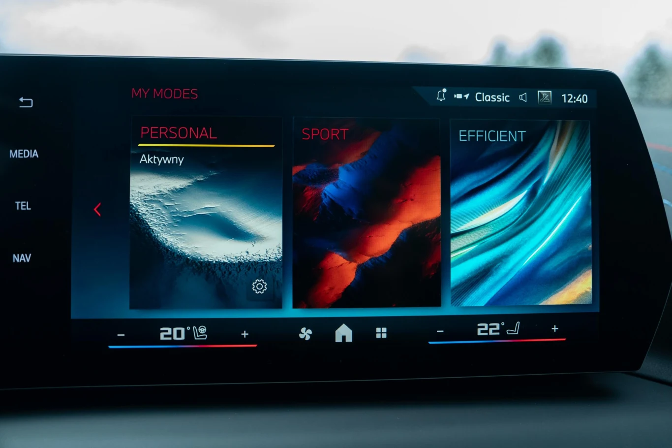 W trybie Sport auto gwałtownie przyspiesza i hamuje, a silnik ma tendencje do pracy na wysokich obrotach. Zupełnie inaczej jest w trybie Efficent, który 300-konną bestię zamienia w cywilny samochód, którym podróżuje się całkiem cicho i wygodnie.