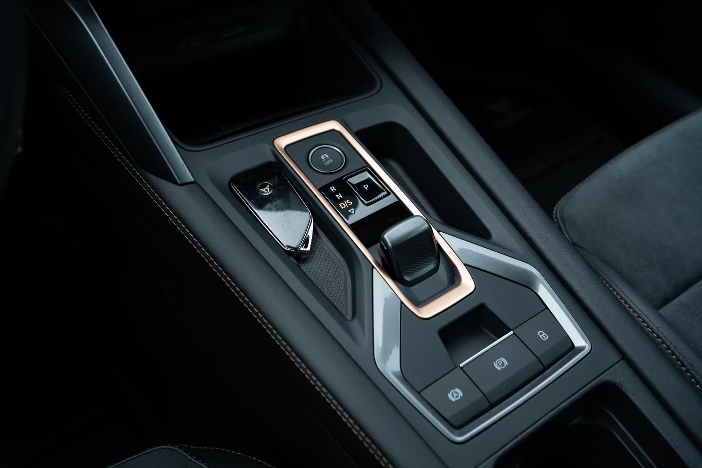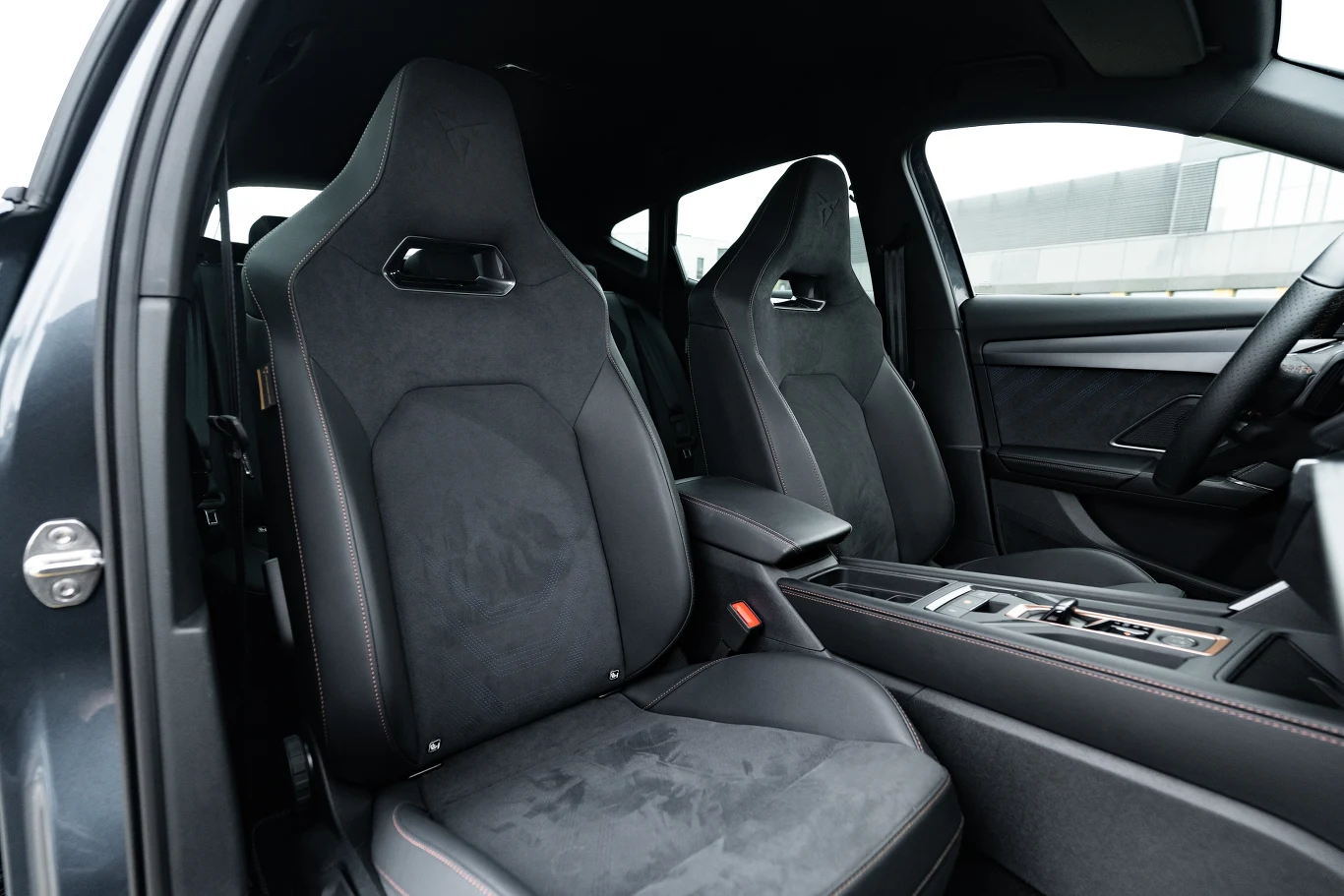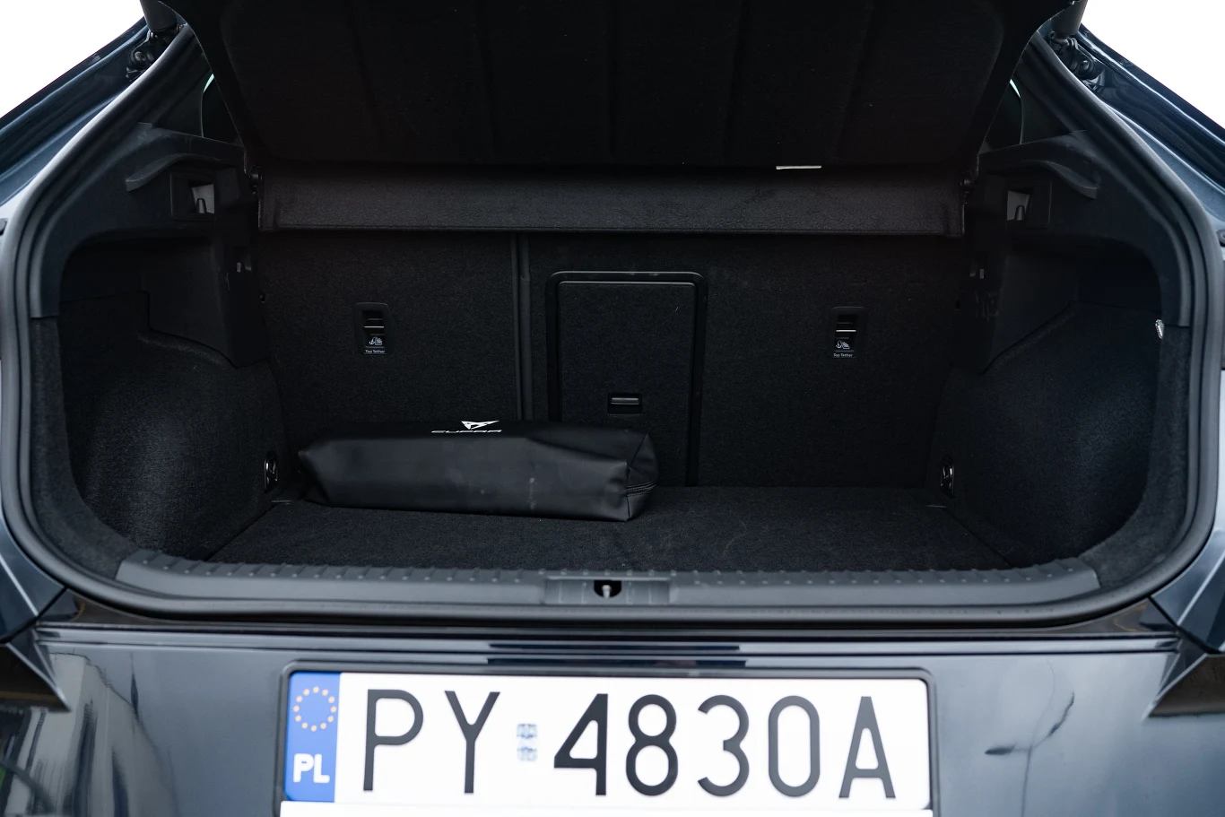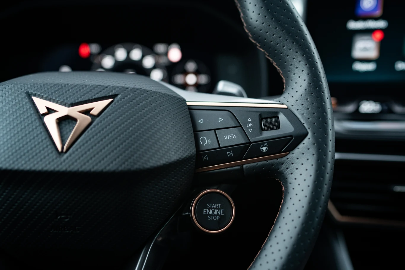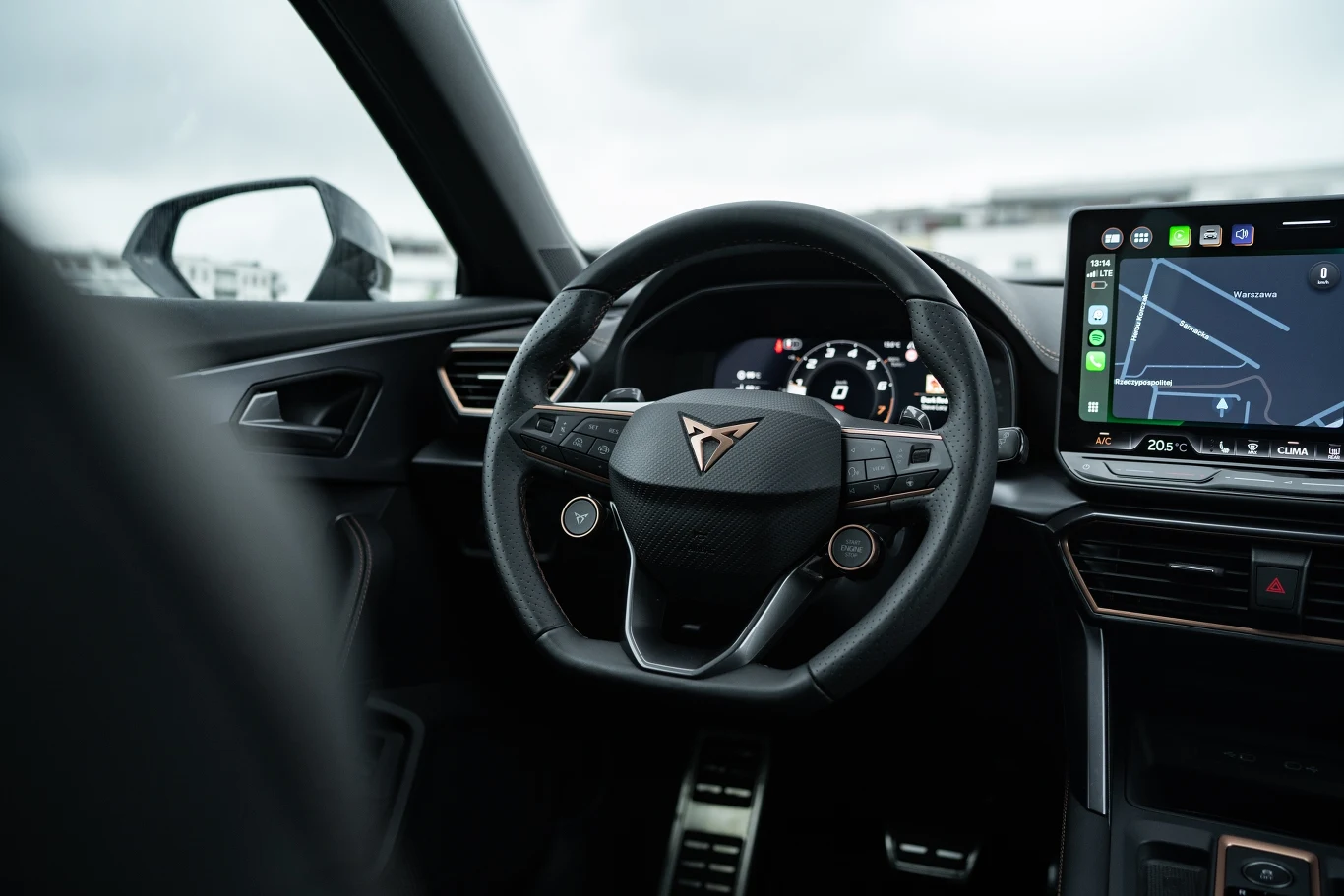 We wnętrzu z kolei nie znajdziemy żadnych elementów z nowego języka stylistycznego Cupry (te pojawiły się dopiero w Tavascanie i Terramarze), więc niezmiennie kierowca ma przed sobą deskę rozdzielczą z Seata Leona. Wyróżnikami są tylko miedziane wstawki, miedziane przeszycie deski rozdzielczej (mające imitować, że obita jest skórą), a także typowa dla marki kierownica z przełącznikiem trybów jazdy oraz przyciskiem uruchamiającym silnik.