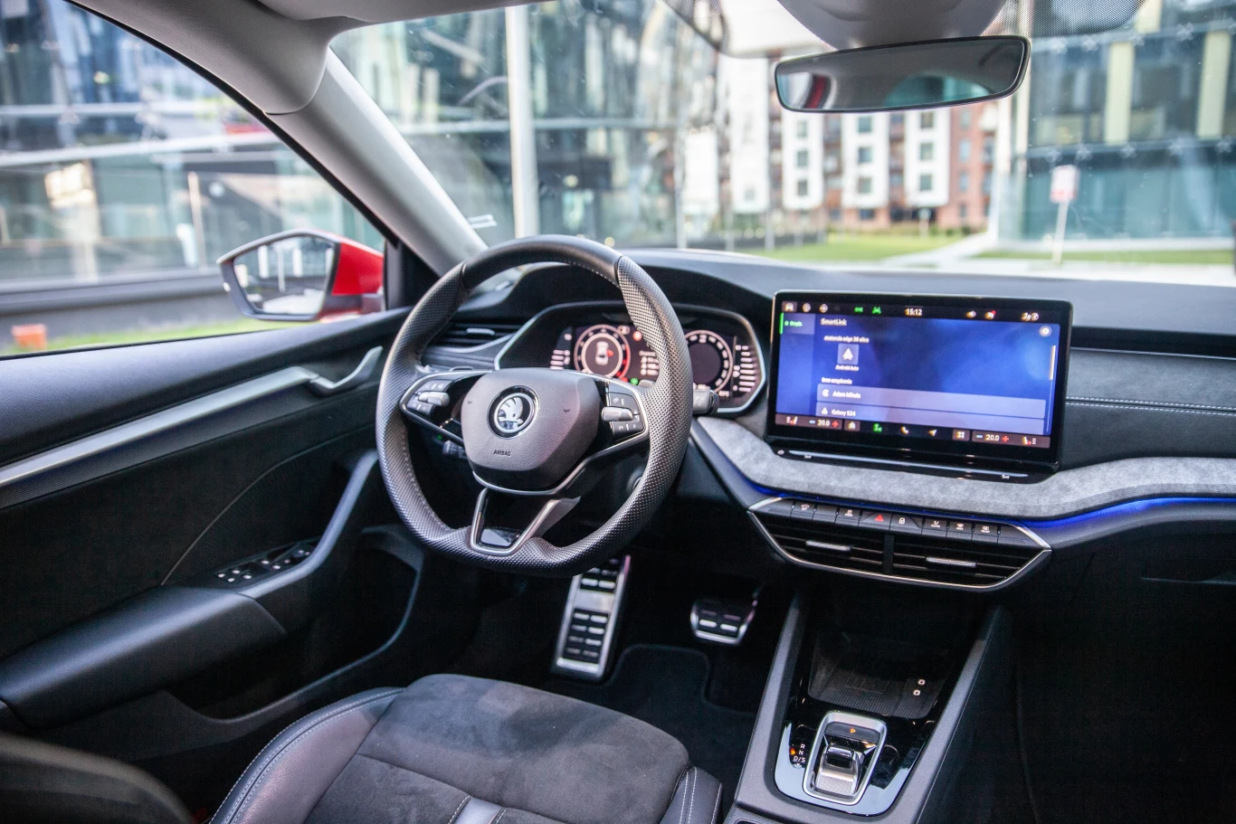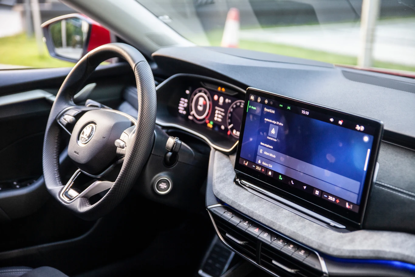 Zarzutów do Octavii nie można mieć również po zajęciu miejsca za kierownicą. Kabina jest obszerna i wykończona w zdecydowanej większości materiałami wysokiej klasy. W tych miejscach, które najczęściej się dotyka, plastyki są miękkie. Samochód wyposażono w ekran cyfrowych zegarów i wolnostojący ekran systemu infotainment, po przeprowadzonej w tym roku modernizacji ma on standardowo 10, a w opcjonalnie, jak w testowanym aucie - 13 cali.