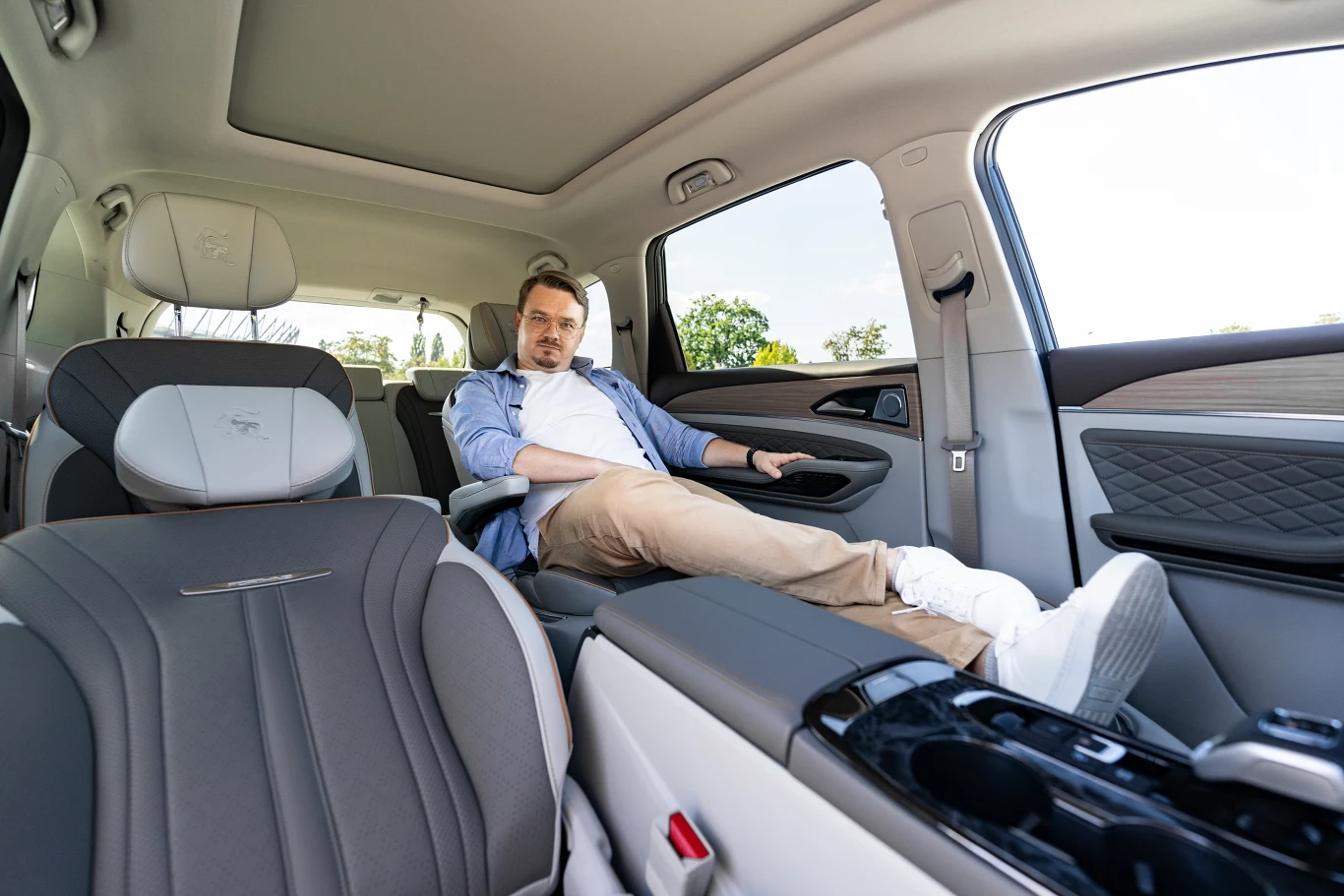 Jeśli to dla nich za mało, to koniecznie powinni zajrzeć do wnętrza auta. I to najlepiej do drugiego rzędu. Znajdą tu dwa kapitańskie fotele - elektrycznie sterowane, podgrzewane i wentylowane, z opcją przesuwania nie tylko do tyłu i przodu, ale również na boki. Przed każdym jest praktyczny stolik, każdy ma wbudowane gniazdo USB i miejsce do odłożenia telefonu. Przestrzeni dla siedzących w tym rzędzie jest mnóstwo, a na postoju można po rozłożeniu dodatkowo foteli z przodu uzyskać całkiem wygodne leżanki. W wersji z jasną tapicerką wnętrze prezentuje się znakomicie!