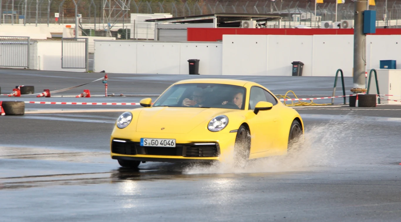 To, jak prowadzi się najnowsza odsłona 911 mogliśmy sprawdzić... pośrednio. Zajmując prawy fotel obok eksperta Porsche, który przewiózł nas po torze Hockenheim. Według jego słów 992 jest bardziej stabilne i prowadzi się posłuszniej, niż poprzednik. Tym, co faktycznie mogliśmy doświadczyć, były naprawdę mocne przyspieszenia (sprint do 100 km/h w 3,5 s), świetny gang silnika (szczególnie po aktywowaniu sportowego wydechu) oraz działanie nowego trybu Wet, czyli przeznaczonego na mokrą nawierzchnię. Ów tryb jest dość ciekawy, ponieważ wpływa na naprawdę wiele elementów. Po pierwsze samochód sam sugeruje jego aktywację - w przednich nadkolach znajdują się czujniki, które po wykryciu wody powodują wyświetlenie odpowiedniej informacji na ekranie komputera pokładowego. Jeśli zdecydujemy się na włączenie trybu Wet, moc zostanie ograniczona (o około 20%) i zmieni się sposób działania automatycznej skrzyni biegów. ESP i kontrola trakcji będą wkraczały bardzo wcześnie, podniesie się tylny spojler oraz zmienią układ klapki we wlotach powietrza w przednim zderzaku. Jeśli mamy wersję z napędem na wszystkie koła, 50% mocy będzie domyślnie trafiało na przednią oś.