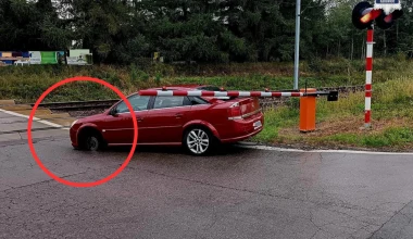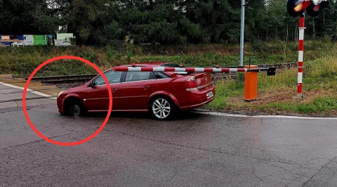 Z auta odpadło koło na środku przejazdu kolejowego. O włos od tragedii