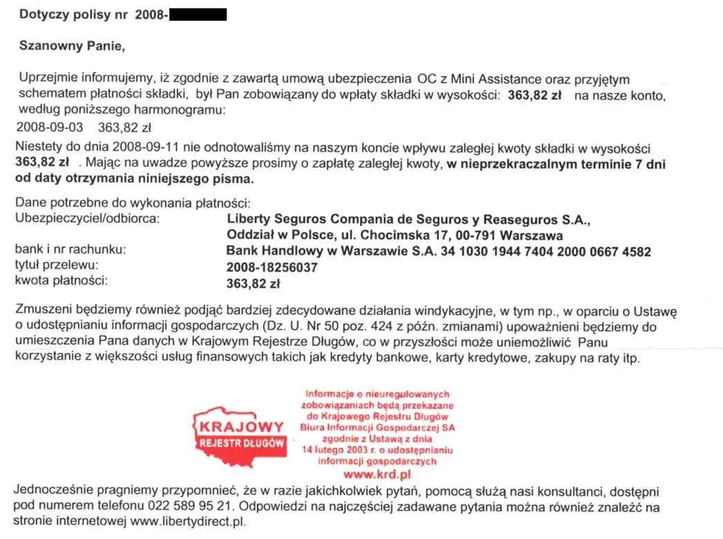 Otóż nie szkoda, bo firma w liście, który kosztował jakieś 2 zł, uprzejmie Cię informuje , że już od kilku dni jesteś ich dłużnikiem. Nie zapłaciłeś przecież raty za polisę OC i jeśli nie uregulujesz należności będą zmuszeni wpisać cię do ogólnopolskiego rejestru dłużników.