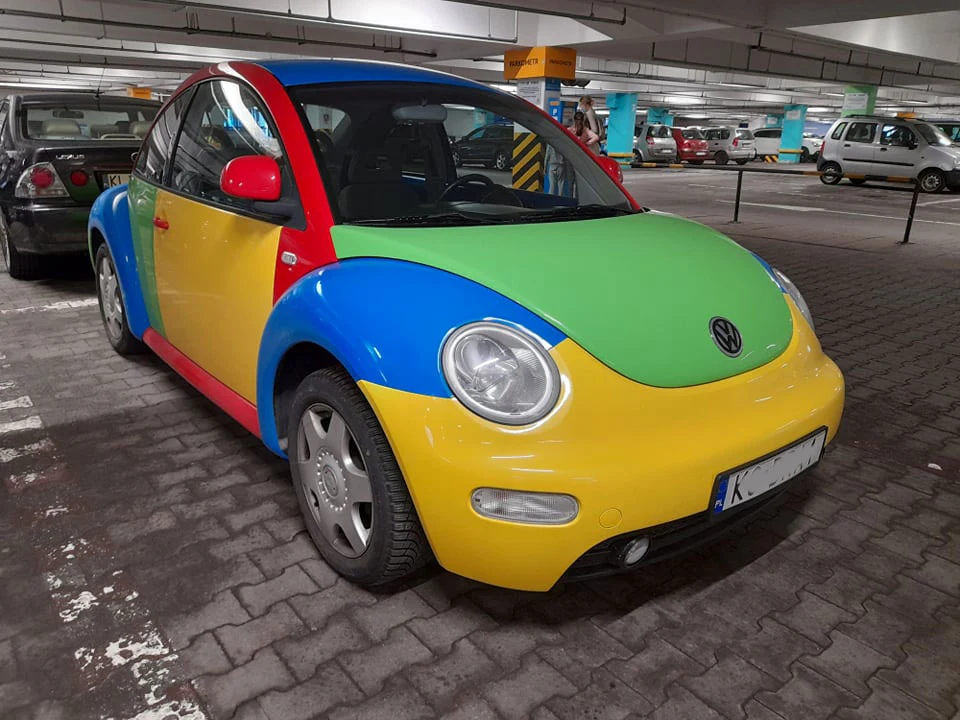 I tak dochodzimy do uchwyconego przez nas ostatnio egzemplarza Volkswagena New Beetle, którego właściciel przerobił na Harlekina, decydując się oczywiście na "jedynie słuszną" kombinację kolorystyczną. W ten oto sposób historia zatoczyła koło - wyjątkowy egzemplarz Garbusa, zainspirowany wyjątkową wersją Polo, zainspirowaną wyjątkowym egzemplarzem Garbusa.