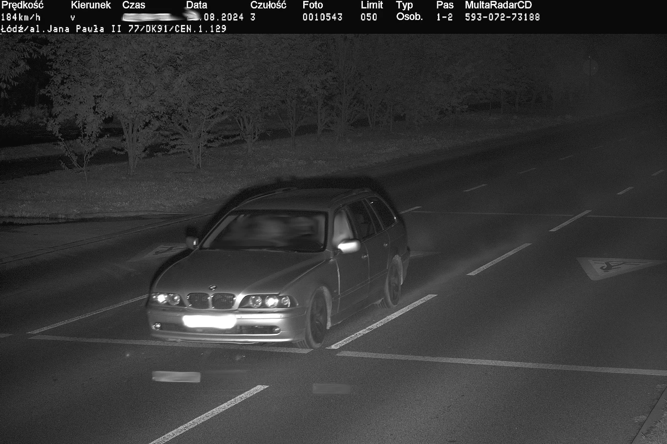 - sierpień, Łódź, al. Jana Pawła II 77, kierujący pojazdem marki BMW przy ograniczeniu do 50 km/h, jechał 184 km/h - przekroczenie o 134 km/h