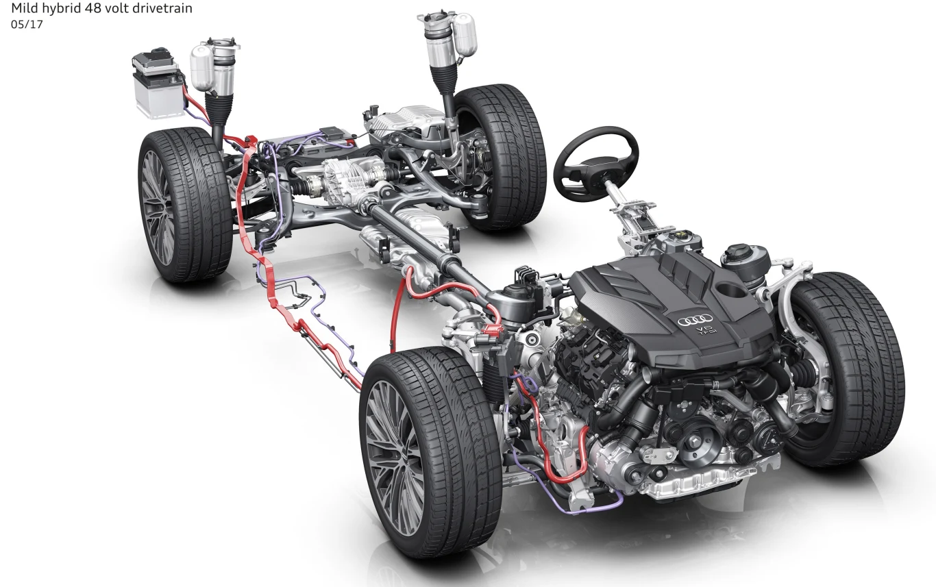 Energia niezbędna dla zasilenia dodatkowego rozrusznika i rozbudowanej pokładowej elektroniki magazynowana będzie w - zamontowanych pod podłogą bagażnika - akumulatorach litowo-jonowych. Zdaniem Audi system mild hybrid w nowym A8 pozwala zaoszczędzić średnio ok 0,7 l benzyny na każde 100 km.