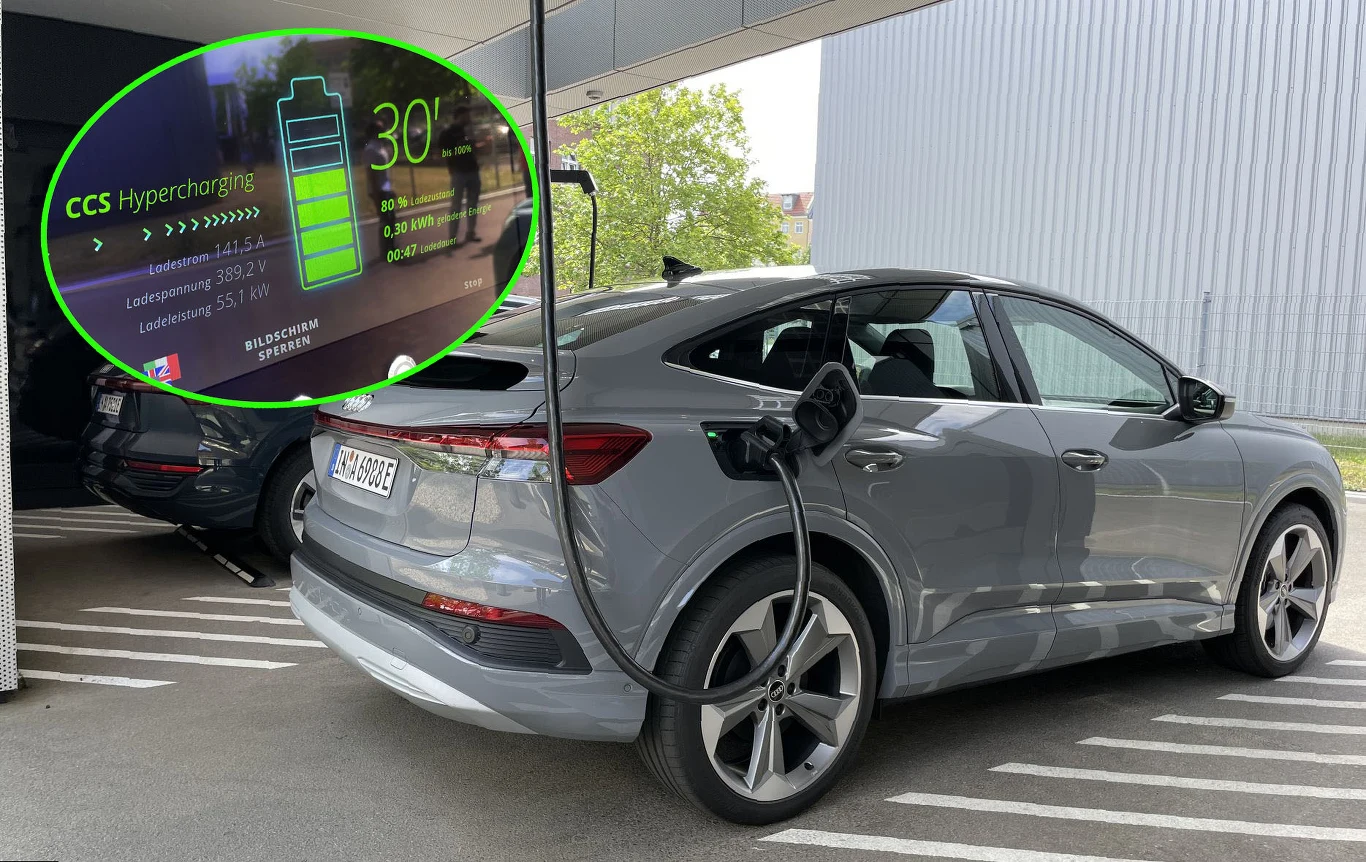 Ładowarka zlokalizowana w Berlinie udowodniła, że naładowanie elektrycznego Audi trwa nieco dłużej niż przerwa w podróży na kawę i skorzystanie z toalety. Testowe Audi RS e-tron GT osiągnęło szczytową moc ładowania 270 kW. To wystarczyło, żeby w czasie około pięciu minut zwiększyć zasięg akumulatora o 100 kilometrów. Półgodzinny postój pozwolił naładować akumulator z poziomu 5 do 80 procent. To wystarczyło, żeby zasięg w sportowym coupe zwiększył się do prawie 260 km.