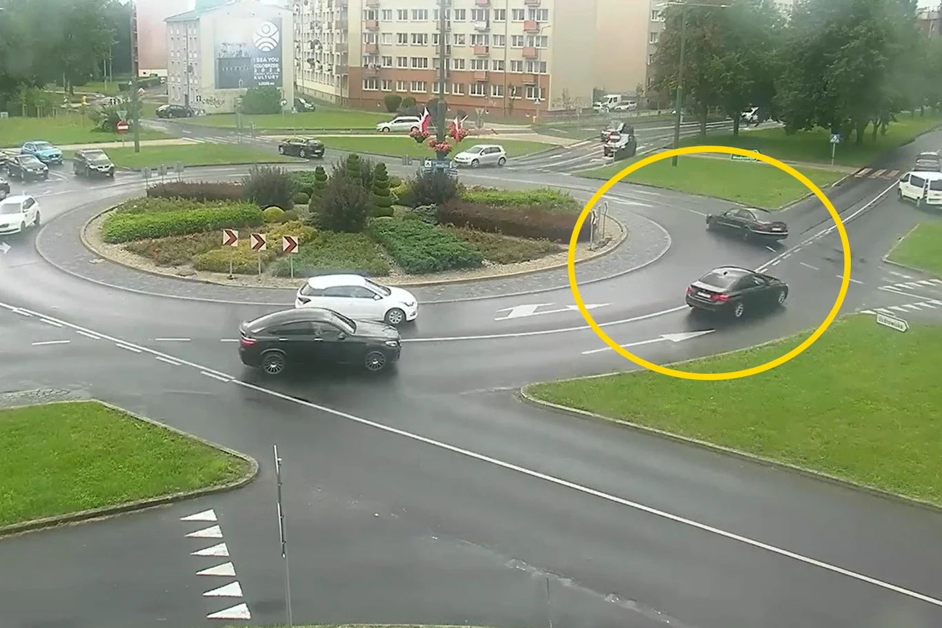 Na krótkim filmiku z kamery monitoringu, udostępnionym przez policjantów, widać, jak Mercedes i BMW wjeżdżają na rondo. Mercedes, który znajduje się na pasie do skrętu w lewo i jazdy na wprost, rusza znacznie szybciej, a gdy zaczyna skręcać próbuje wejść w drift. Robi to jednak bardzo nieumiejętnie, auto co prawda wpada w poślizg, ale o żadnym driftowaniu mowy nie było.