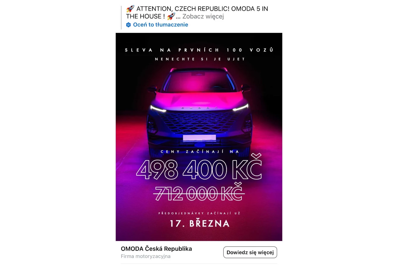 Aktualizacja: Czeski oddział Omody informuje potencjalnych kientów z Polski, że to propozycja wyłącznie dla obywateli Czech, a auto po zakupie musi być zarejestrowane w tamtym kraju. Odmawia okazania regulaminu akcji promocyjnej.