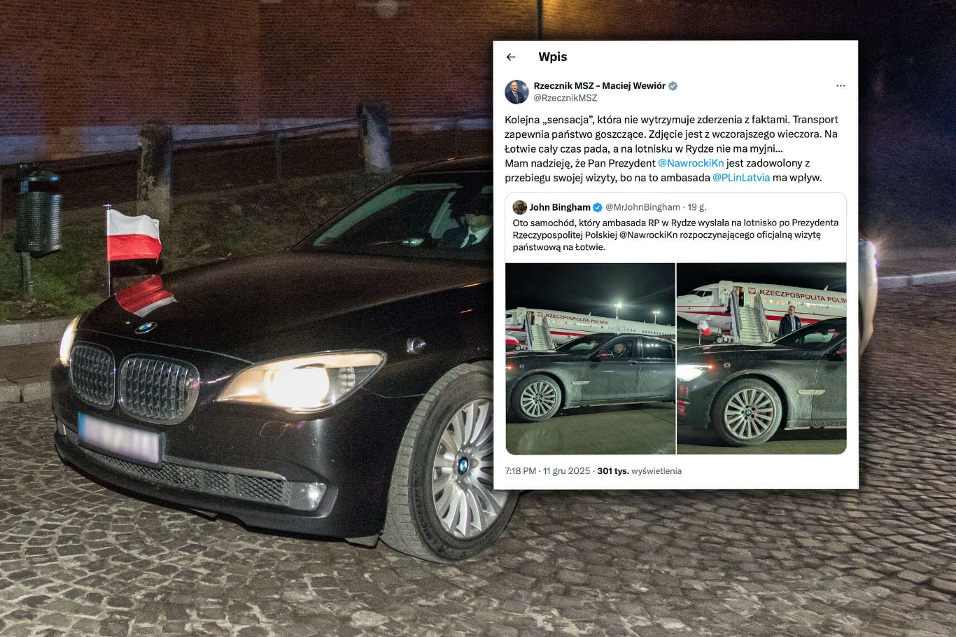 Oznacza to, że BMW widoczne na zdjęciach było elementem infrastruktury ochronnej zapewnionej przez stronę łotewską, a nie pojazdem pozostającym w dyspozycji polskiej placówki dyplomatycznej czy Kancelarii Prezydenta RP.