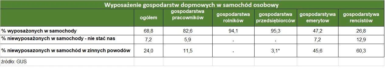Najnowsze dane GUS, opublikowane pod koniec stycznia br. w raporcie "Dochody i warunki życia ludności Polski", choć obejmujące wyniki badania przeprowadzonego w 2018 roku, wskazują, że w samochód osobowy wyposażonych jest 68,8% gospodarstw domowych w Polsce. 7,2% rodzin deklaruje, że nie stać ich na posiadanie auta, a 24% twierdzi, że nie ma samochodu z innych powodów. Może to być np. brak prawa jazdy, względy zdrowotne czy też względy ekologiczne.