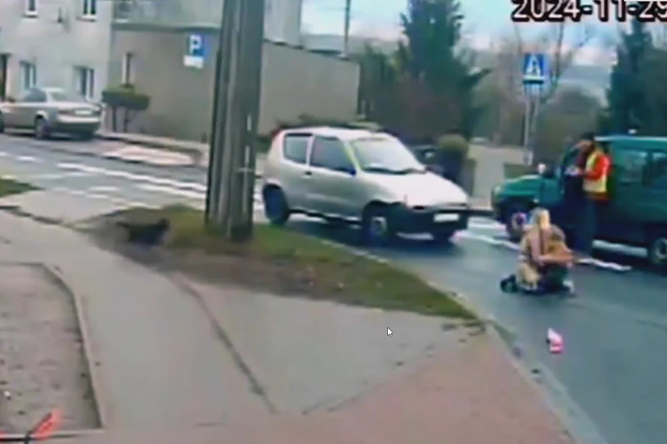 Do wypadku doszło w piątek rano, na przejściu przy ul. Janickiego w Żninie. Na filmie widać, jak do przejścia podchodzi kobieta, która prowadzi za rękę dziecko. Przed przejściem zatrzymuje się kierowca samochodu jadącego z prawej strony strony.