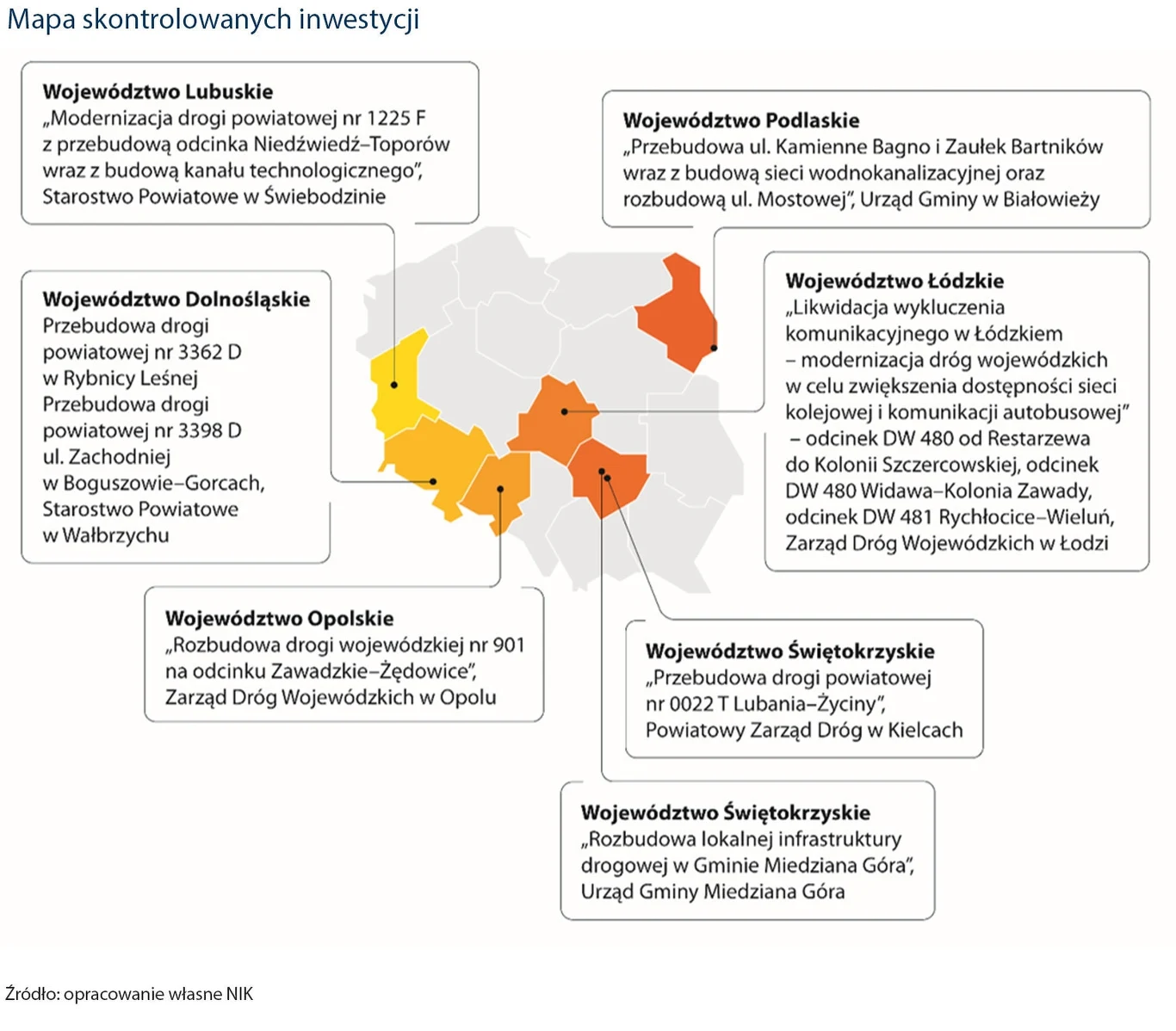 Dodatkowo stwierdzono, że w kontrolowanych jednostkach nie zagwarantowano skutecznego nadzoru budowlanego nad wykonawcami na wszystkich etapach inwestycji, obejmujących przygotowanie, realizację oraz odbiór robót. Odnotowano także przypadki odbioru oraz wypłaty wynagrodzenia za prace, które w rzeczywistości nie zostały wykonane lub znajdowały się w trakcie realizacji.