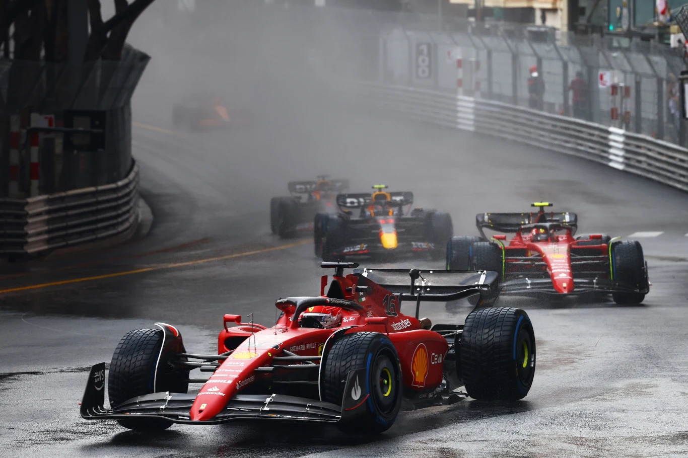 Gdy rywalizację wznowiono około godz. 16, wszyscy mieli założone opony deszczowe. Ale już po kilku kółkach, gdy przestało padać, okazało się, że można założyć slicki. I to był przełomowy moment w tym wyścigu, w którym dotychczas prowadził Leclerc. Za nim jechał Sainz Jr., Perez i Verstappen. Jako pierwsi opony wymienili swoim kierowcom w Red Bullu, ekipa Ferrari zwyczajnie zaspała. Do tego brak koordynacji spowodował, że w tym samym czasie w pit stopie pojawił się Sainz i Leclerc. Ten drugi, lider, musiał czekać na swoją kolejkę. Stracił kilkanaście sekund i na tor wrócił dopiero na czwartej pozycji.