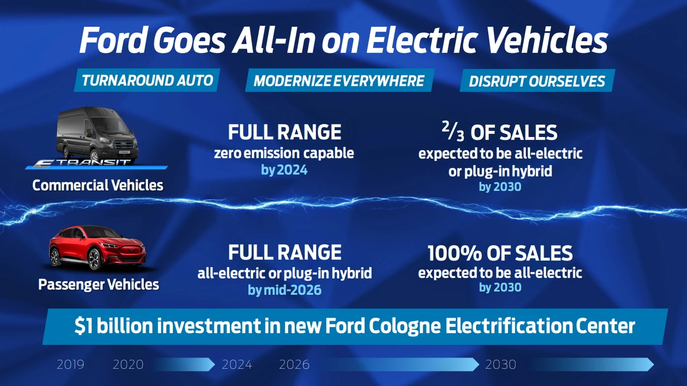 Głównym impulsem dla Forda w kierunku całkowicie elektrycznej przyszłości jest nowa inwestycja o wartości 1 miliarda dolarów, mająca na celu modernizację montowni pojazdów w Kolonii w Niemczech, jednego z największych ośrodków produkcyjnych w Europie i siedziby Ford of Europe. Inwestycja ta przekształci istniejące zakłady montażu pojazdów w Centrum Elektryfikacji Ford Cologne Electrification Center, ukierunkowane na produkcję pojazdów elektrycznych. Będzie to pierwszy taki zakład Forda w Europie.