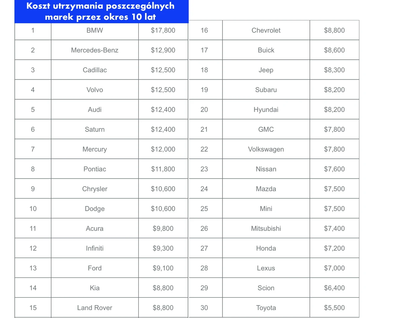 Jak widać, zdecydowanie najdroższe w utrzymaniu są samochody europejskich marek premium. W pierwszej dziesiątce znalazły BMW, Audi, Mercedes i Volvo. Przy czym o ile różnice w przypadku wszystkich marek są kilkusetdolarowe, to BMW dzieli od drugiego w zestawieniu Mercedesa aż 4900 dol. Przeciętny koszt serwisu, napraw etc. aut marki z Monachium to 17,8 tys. dolarów przez 10 lat czyli - po przeliczeniu - niemal 75 tys. zł (uśredniona kwota dla wszystkich modeli).