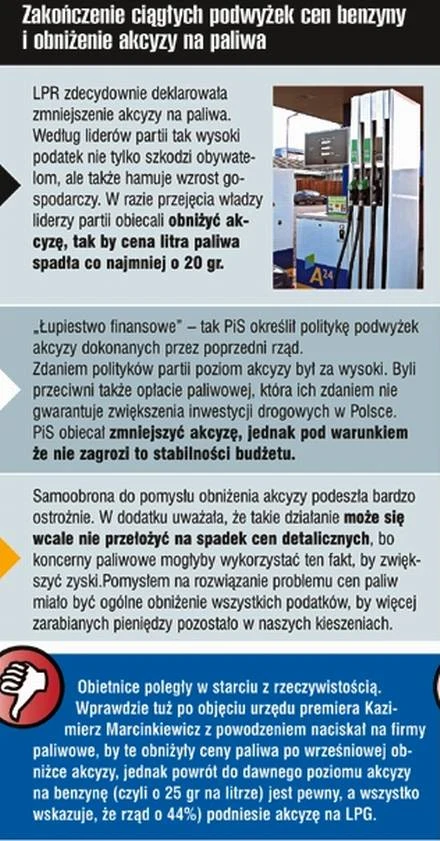 Przed wyborami zarówno Prawo i Sprawiedliwość, jak i Liga Polskich Rodzin deklarowały obniżenie podatków zawartych w cenie paliwa. Samoobrona była za utrzymaniem stanu faktycznego. Tymczasem lada moment akcyza na benzynę pójdzie o 25 gr na litrze w górę, a w 2007 roku trzeba się liczyć z radykalnym wzrostem akcyzy na LPG, która wywinduje cenę tego rodzaju paliwa o kilkadziesiąt groszy w górę. Trudno się więc dziwić, że politycy PiS nie chcą się tym chwalić. "Na razie obowiązuje obniżona stawka akcyzy na benzynę" - powiedziała nam posłanka Aleksandra Natalli-Świat, szefowa sejmowej Komisji Finansów Publicznych. Przypominamy, że akcyzę czasowo obniżono o 25 gr na litrze benzyny jeszcze decyzją ministra finansów w rządzie Marka Belki. Natomiast dziś urzędnicy Ministerstwa Finansów potwierdzają, że decyzja o powrocie do "normalnej stawki akcyzy" (czyli de facto podwyżki) jest już podjęta. Minister Zyta Gilowska czeka tylko na odpowiedni moment z jej ogłoszeniem.
