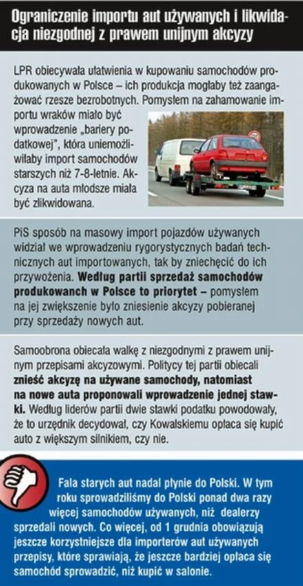 Jedynie LPR mówi wprost o wprowadzeniu "bariery" dla pojazdów najstarszych. "Możemy wprowadzić zasadę nierejestrowania w Polsce po raz pierwszy aut starszych niż siedmioletnie" - przekonuje Andrzej Fedorowicz i zapewnia, że ta propozycja została wpisana do umowy koalicyjnej i jest przewidziana do realizacji w pierwszym kwartale 2007 r. Dziś sprowadzamy głównie najtańsze samochody kilkunastoletnie, ale nie sposób ocenić, czy zablokowanie tej możliwości wpłynie na wzrost sprzedaży nowych aut.