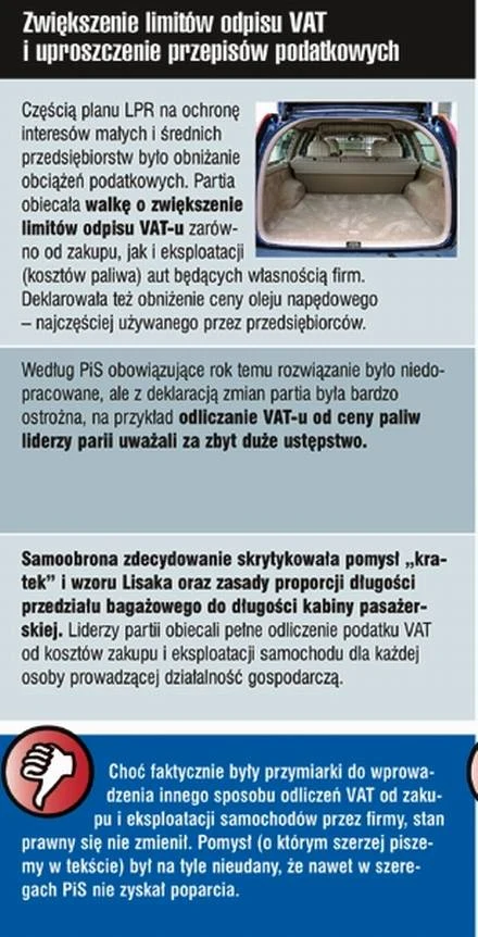 Minister Gilowska chciała zwiększyć odpisy VAT-u od zakupu aut, ale równocześnie dodatkowo opodatkować ich używanie do celów prywatnych. "Propozycja Zyty Gilowskiej była dobra, ale jeśli rząd zwiększa wydatki budżetowe, to nie może sobie pozwolić na ustępstwa podatkowe wobec przedsiębiorców" - ocenia poseł Zbigniew Chlebowski z Platformy Obywatelskiej. Przed wyborami PO zapowiadała uproszczenie tych przepisów tak, by odpis VAT-u był taki sam niezależnie od rodzaju samochodu (jak to ma miejsce dzisiaj).