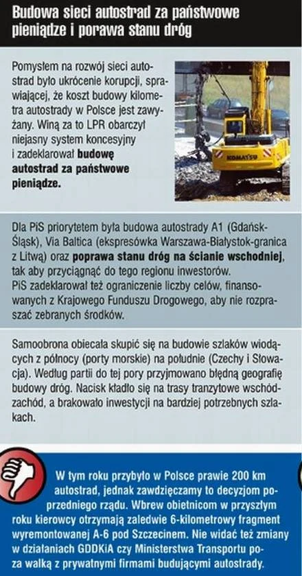 Jesienią ub. r., przed wyborami parlamentarnymi zapytaliśmy polityków, jakie są ich propozycje w najważniejszych sprawach dotyczących kierowców: budowy dróg, cen paliw, opodatkowania zakupu samochodów, bezpieczeństwa na drogach. Po pełnym roku pracy nowego parlamentu przyszedł czas na rozliczenie z obietnic.