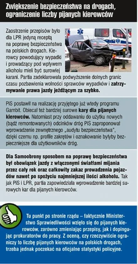Rządowi udało się wprowadzić w życie przepisy zaostrzające kary dla pijanych kierowców. Dziś taka osoba może stracić samochód (staje się on gwarancją zapłaty grzywny), a przed kilkoma dniami prezydent podpisał ustawę zezwalającą na osądzenie pijanego kierowcy w ciągu zaledwie trzech dni. Na efekty tych zmian trzeba będzie jednak poczekać, a na razie liczba wykrytych przypadków jazdy po pijanemu wcale nie spada w porównaniu z ub.r. Może dlatego, że zmiany prawa nie dotarły jeszcze do świadomości wszystkich kierowców. Cieszą też zapowiedzi przedstawicieli LPR i Samoobrony, którzy popierają wprowadzenie obowiązku jazdy z włączonymi światłami przez cały rok.