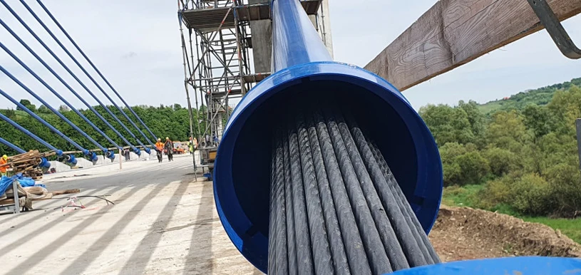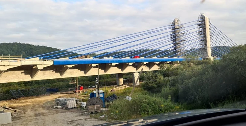 602 metry długości, ponad 17 metrów szerokości, a do tego trzy pylony o wysokości 33,5 m. Tak w skrócie można opisać trzeci największy w Polsce most typu extradosed, który powstaje w ciągu drogi krajowej nr 75 na Dunajcu w Kurowie koło Nowego Sącza. Płyta mostu połączyła już brzegi rzeki i zbudowano dwa z trzech pylonów. Na jednym z nich zamontowano wszystkie wanty. Zaawansowanie wszystkich prac wynosi ponad 81 proc., w tym w branży inżynierskiej ponad 90 proc., a drogowej ponad 78 proc. Sama budowa rozpoczęła się pod koniec lipca 2019 roku.