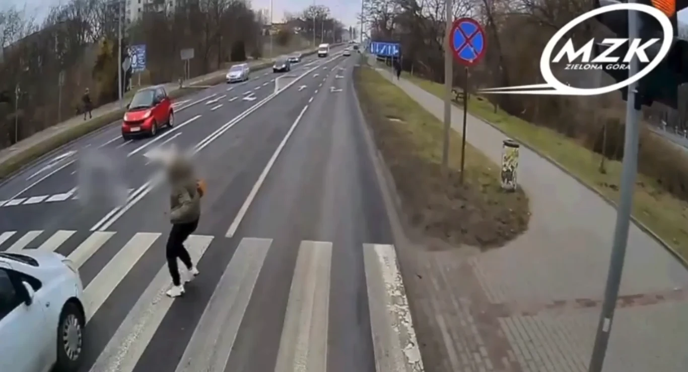 Kamery zamontowane w autobusie miejskim zarejestrowały niebezpieczną sytuację, do której doszło na ulicy Sulechowskiej w Zielonej Górze. Kierowca autobusu zatrzymał pojazd, chcąc umożliwić przejście pieszej, która zbliżała się do pasów. Gdy kobieta weszła na zebrę na lewym pasie pojawił się Opel, który ominął autobus i niemal potrącił pieszą. Do wypadku nie doszło tylko dlatego, że wykazała się refleksem i zdążyła się zatrzymać.
