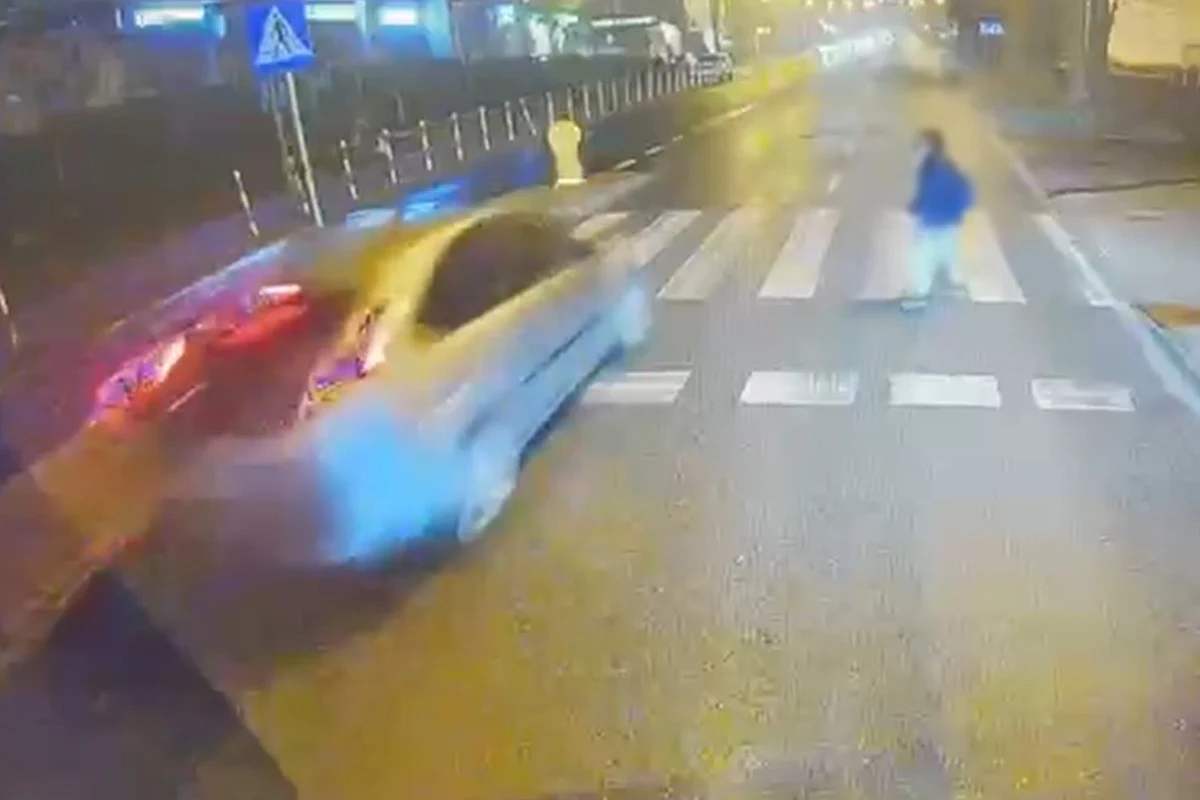 Nagranie wykonane zostało kamerą monitoringu zamontowaną w miejskim autobusie. Kierowca tego pojazdu stał na przystanku, za którym wyznaczono przejście dla pieszych. Na przejście wszedł pieszy, nabywając pierwszeństwo przez samochodami.