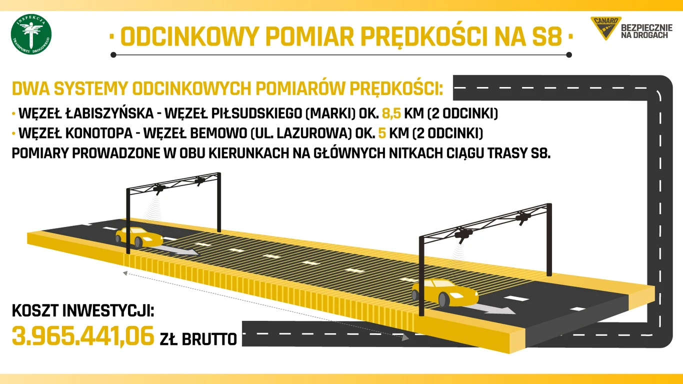Według informacji przekazanych przez rzeczniczkę Głównego Inspektoratu Transportu Drogowego w środę zakończyły się odbiory techniczne dwóch odcinkowych pomiarów prędkości na warszawskim odcinku trasy S8 pomiędzy węzłem Łabiszyńska a węzłem Piłsudskiego (Marki) oraz węzłem Konotopa a węzłem Bemowo (ul. Lazurowa).
