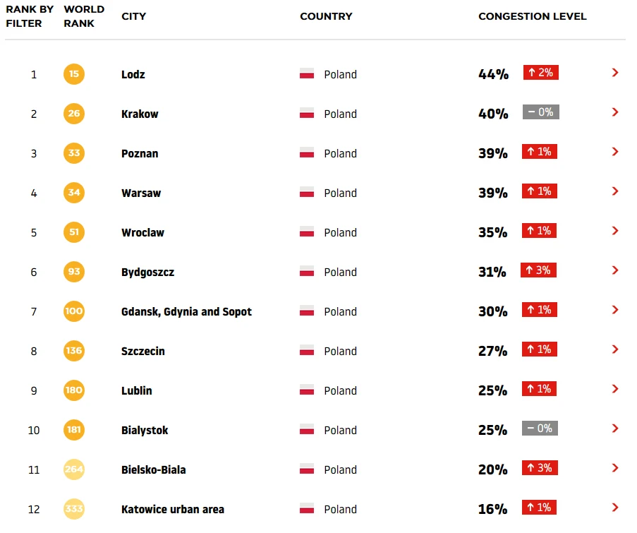 W zestawieniu dziesięciu najbardziej zakorkowanych miast Starego Kontynentu znalazły się też - sklasyfikowana na 7. pozycji - Łódź (15. miejsce światowego rankingu) i 9. Kraków (26. miejsce światowego rankingu).