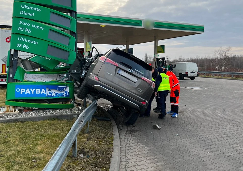 Niebezpieczny pościg zakończył się na jednej z okolicznych stacji paliw. Mężczyzna kierujący japońskim SUV-em em z impetem uderzył w pylon cenowy, a sam wypadek okazał się na tyle poważny, że konieczna była interwencja strażaków, aby uwolnić kierowcę z rozbitego samochodu.