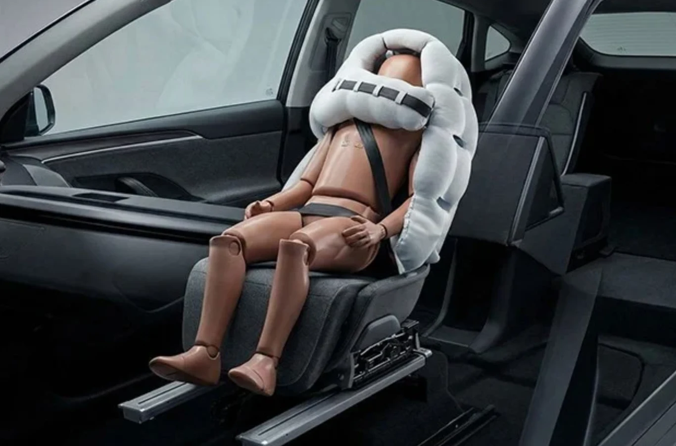 Najciekawszy element to duży airbag wyglądający jak kask rozwijany z oparcia. Ma on otoczyć nie tylko głowę, ale też szyję, klatkę piersiową i barki, czyli te strefy, które przy złej pozycji siedzenia są szczególnie narażone na urazy. Różnica względem klasycznych kurtyn czy bocznych poduszek polega na tym, że tutaj poduszka "podąża" za fotelem i pozycją pasażera, zamiast opierać się na stałych punktach w słupkach i podsufitce.